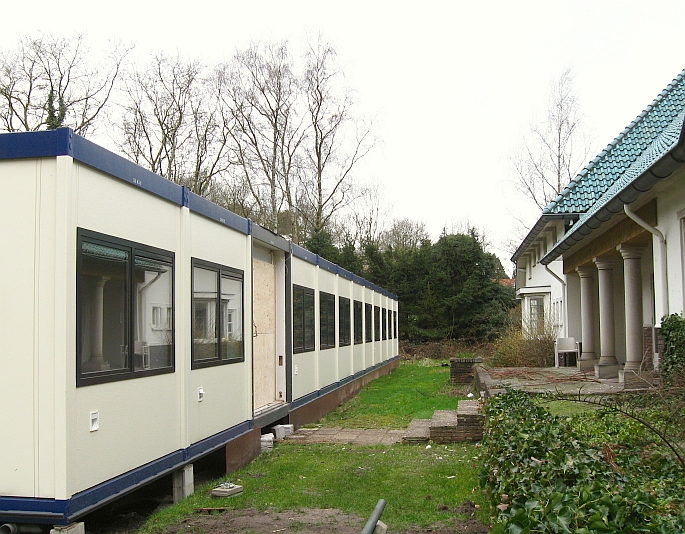 (Nee, lege kantoorkabines die prima als noodschool dienst hadden kunnen doen, bij een inmiddels leegstaand voormalig gemeentehuis waarvan het nog maar de vragen zijn of de tweede helft van de verkoopsom (5 mln) wel zal worden betaald en of het gebouw ooit zal worden verbouwd tot luxe appartementen – en dan bij voorkeur niet volgens de tekeningen die nu daarover circuleren… Al met al is Torenlaan 50 nu in meerdere opzichten een gemeentelijke ‘pain in the ass’.)