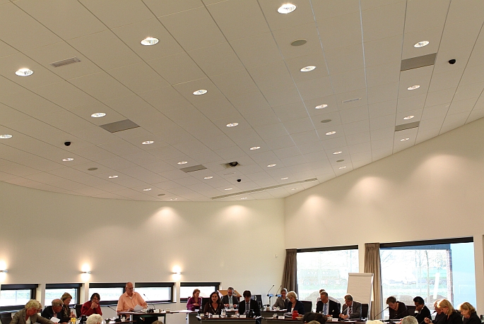 Raadzaal of raadszaal? Zie hier en concludeer dat het beter raadszaal kan zijn. Boven de zaal in kwestie staat echter raadzaal.