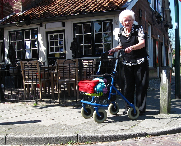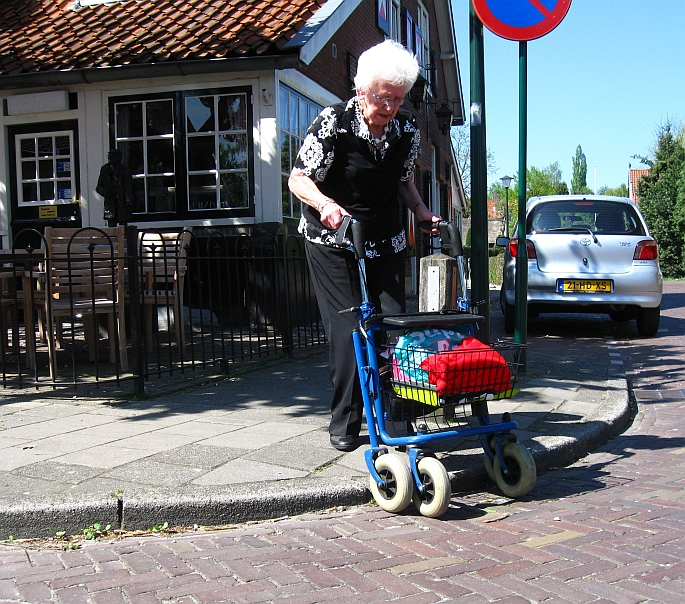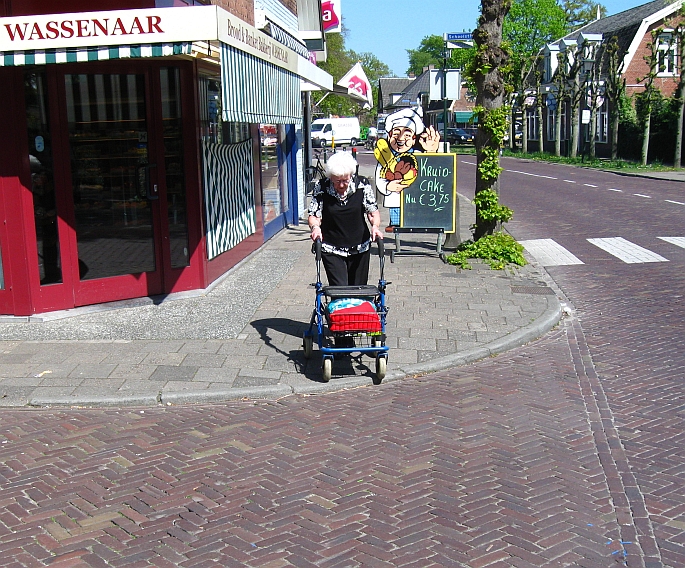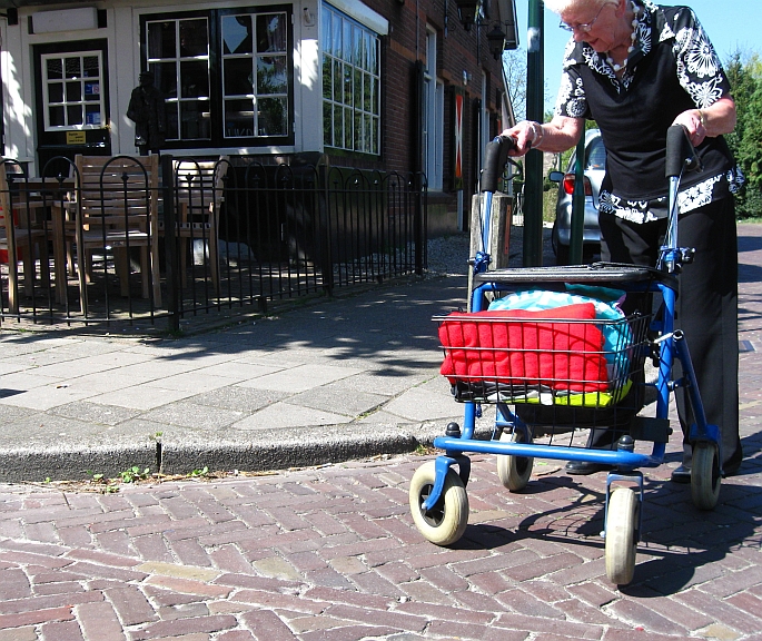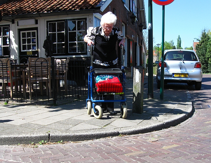 Van de winkels in het Dorp naar de Torenhof (en v.v.) met de rollator gaat overal goed, behalve bij het Binnendoor (de zijweg bij Moeke en Bakkerij Wassenaar). Daar zijn de stoepranden niet verlaagd. Rollatorgebruikers kukelen bijna over hun rollator van de stoep af; krijgen dat ding vooruitrijdend niet de volgende stoep op, moeten dus 180 graden draaien, achteruit de stoep op stappen (oppassen dat ze daarbij niet struikelen), de rollator meetrekken die daardoor half inklapt, vervolgens op de stoep het ding vol met boodschappen weer uitklappen.