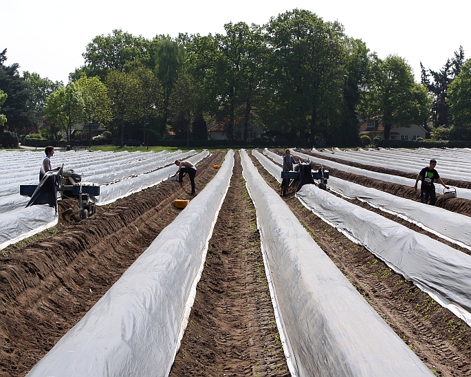 Die worden niet geplukt noch gerooid maar gestoken. De plastic zeilen dienen niet alleen om het groeiproces te bevorderen (warmte!), maar ook om de asperges te behoeden tegen verkleuring door de zon. Om toch te kunnen steken zijn ingenieuze karren bedacht die het zeil optillen waar gestoken moet worden en de rest afgedekt laten.