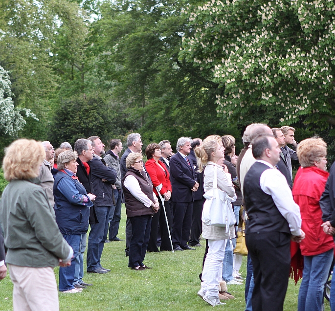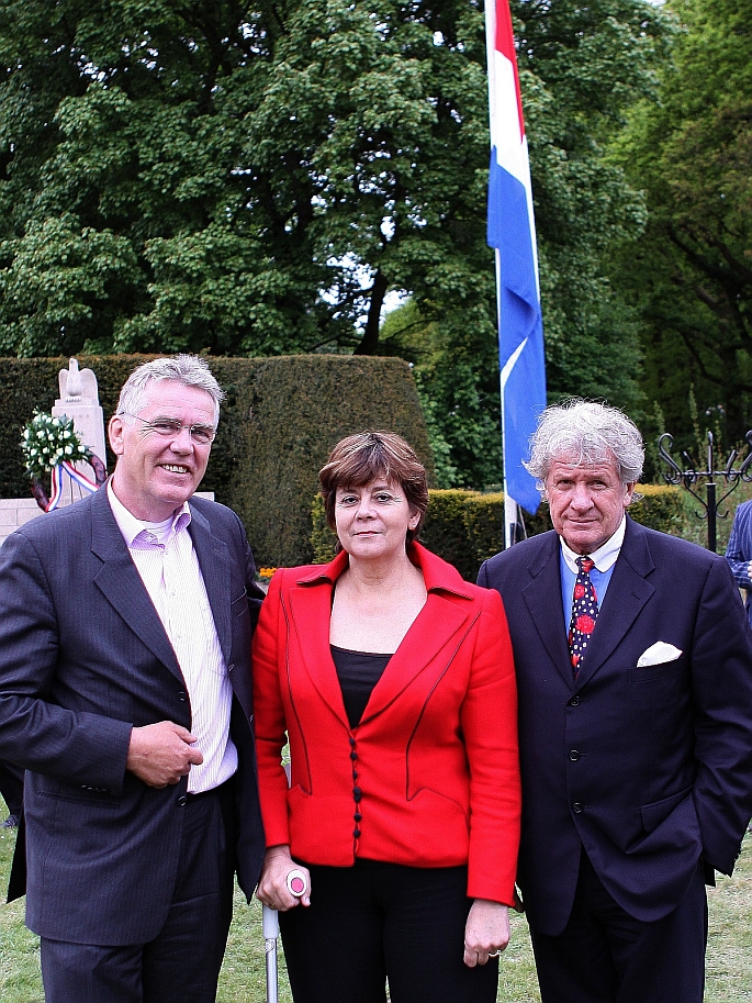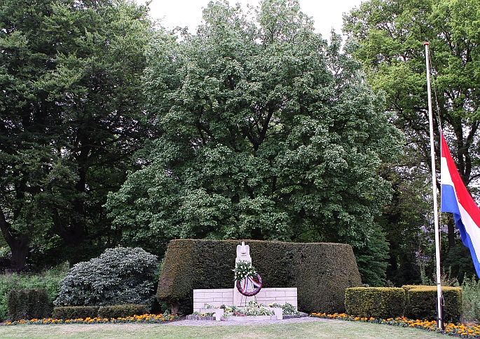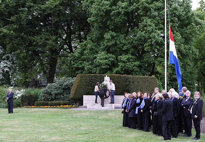 Burgemeester De Zwart legt een krans; links de hoornblazer, rechts het Gemengd Blaricums Koor.