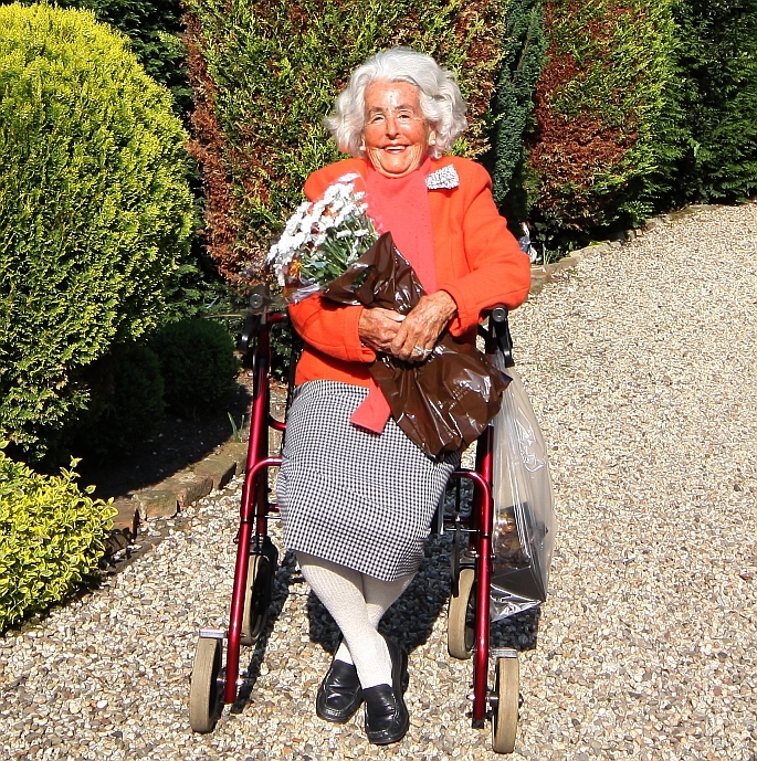 … dat u mij fotografeert. Ik wacht op mijn zoon, dan gaan we naar mijn kleindochter in Amsterdam. Eerst een rondvaart en dan een kopje koffie in Americain. Ja, en die bloemen zijn voor haar, enig hè?!