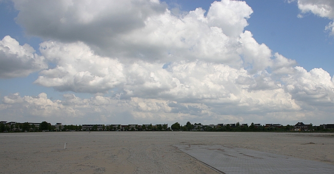Vierde Kwadrant (ten onrechte zelfs door het gemeentelijk apparaat Blaricummermeent genoemd) ligt klaar om te worden bebouwd, de stratenstructuur is reeds aangelegd; foto genomen richting Derde Kwadrant van Huizen.