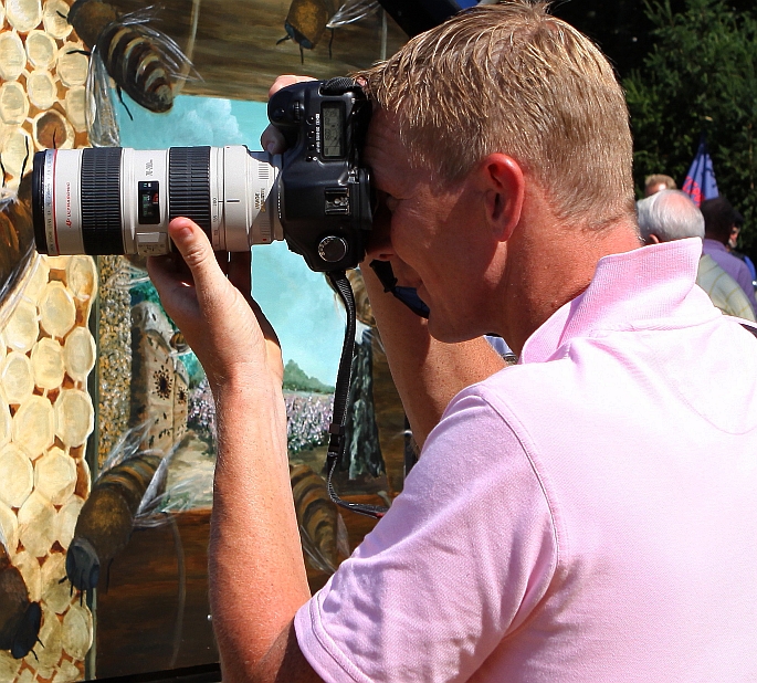 Persfotograaf Bob Awick (bekend van menig foto in de regionale media) aan het werk op het oogstfeest van de S.O.L. te Laren.