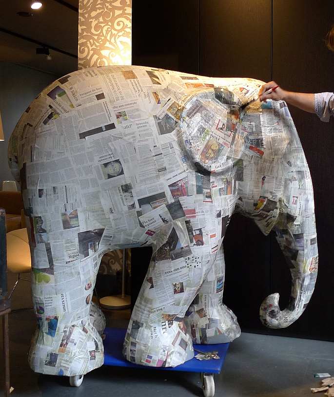 Dit is de doordachte onderlaag. Uiteindelijk zal ik er niet meer als een kunstolifant uitzien, maar als een echte. Ik krijg een ongekende werkelijkheidsallure, de mensen zullen schrikken.