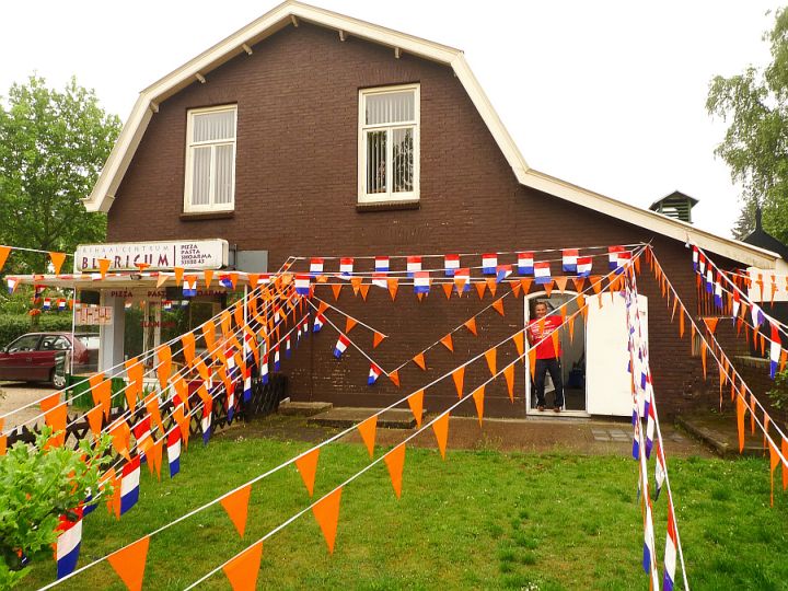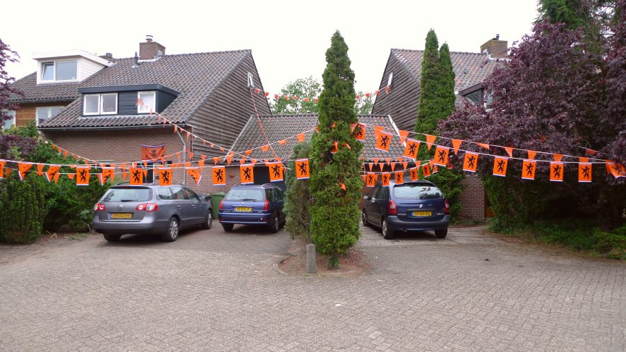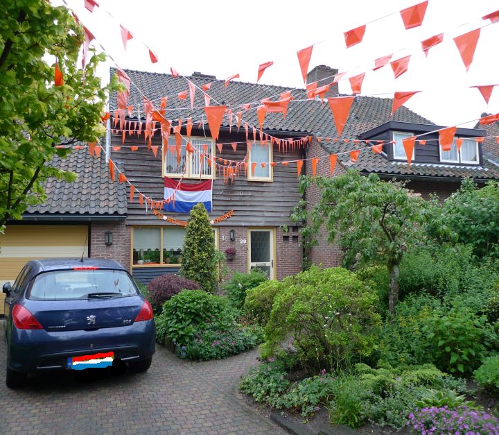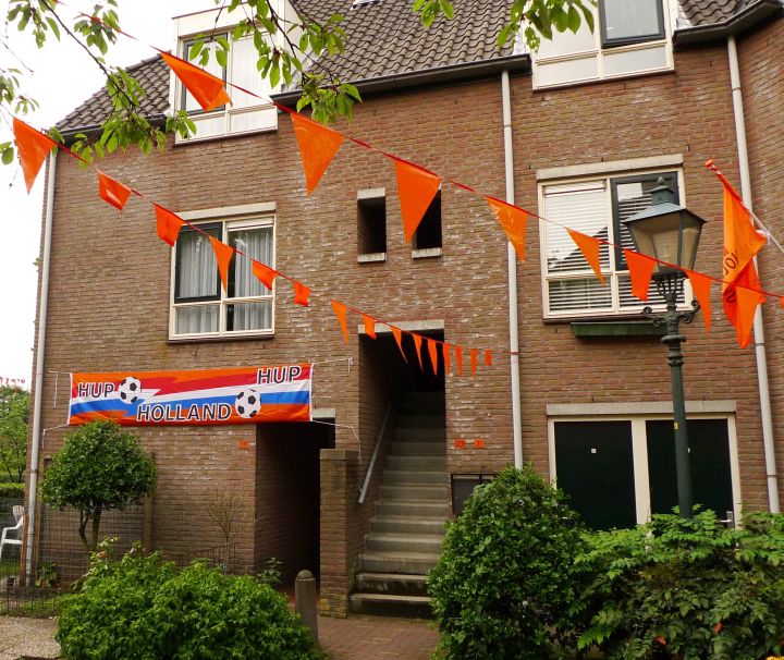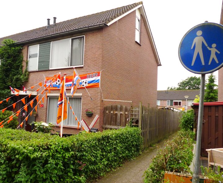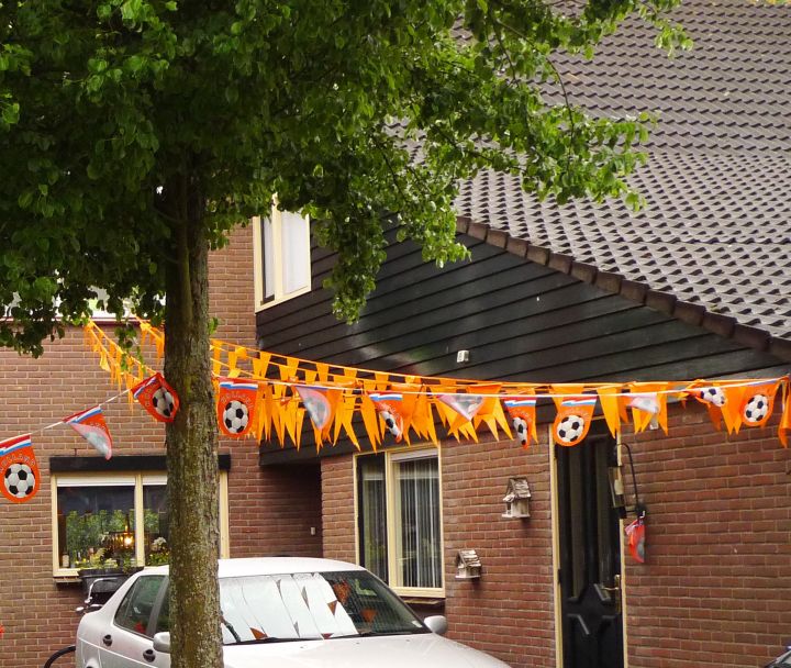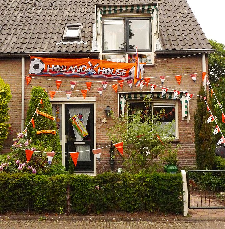 Dochtertjelief vond het een leuk idee om ons huis op een gelijke wijze te versieren. Maar hoewel ik het Nederlands elftal een warm hart toedraag zie ik die oranje rommel toch liever niet aan onze gevel vastzitten.
