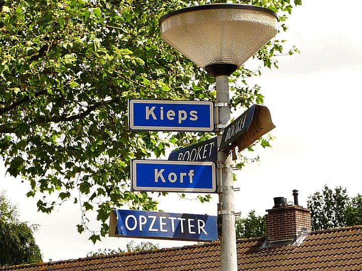 Wat ook uit deze foto blijkt, is dat de gemeente kennelijk niet veel geld meer heeft. Je ziet hier nu twee nieuwe straatnaambordjes (Kieps, Korf) maar de Booket heeft nog een oud bordje. Nou is dat laatste bordje nog wel aardig leesbaar, maar in de omgeving van Stam/Stobbe/Viersloot/’t Erf zijn de bordjes nauwelijks meer leesbaar…. overgroeid met groene aanslag en de witte verf van de letters is nog slechts minimaal aanwezig. Waarom niet alle bordjes in één keer vervangen? Toont veel netter en frisser!