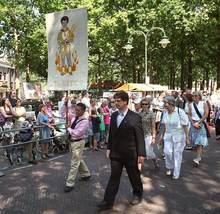 De heren Vos en Kukupessy zijn de vaandeldragers van Sint Vitus. En jullie boffen, want onze Vituskerk heeft nog meer vaandels. En wel een paar beste zware. Bij deze zijn jullie volgend jaar uitgenodigd in pak met stropdas en glimmende schoenen bij een temperatuur van minstens 30 graden de Vitusvaandels vanaf de basiliek naar het Sint Janskerkhof te dragen en weer terug. En ook de stropdas omhouden en de schoenen laten glimmen als je in de brandende zon ruim een uur naar de mis luistert op het stoffige kerkhof!