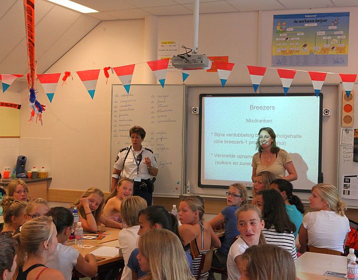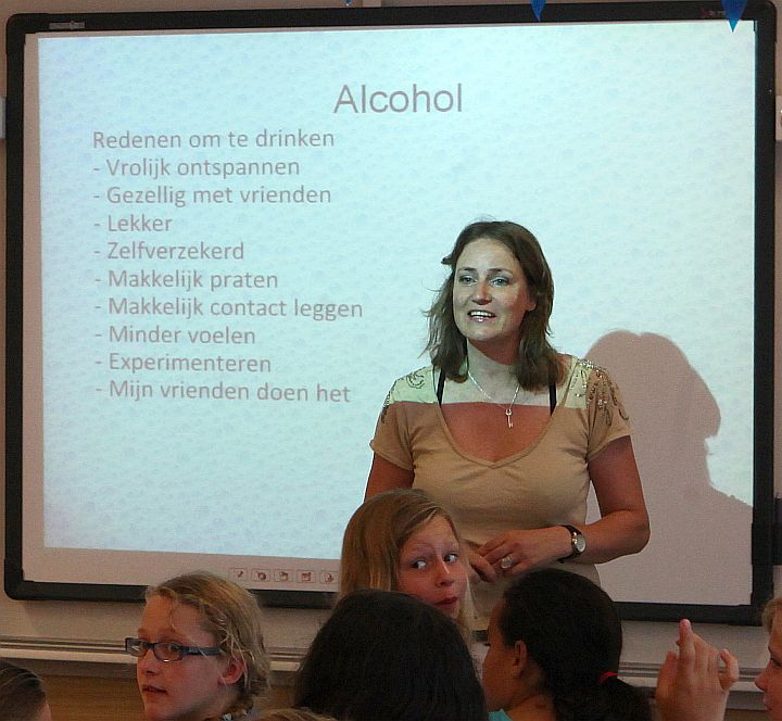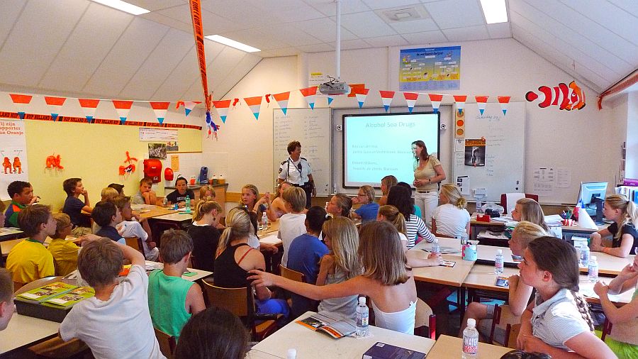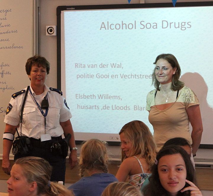 Wijkagent Rita van der Wal en huisarts Elsbeth Willems hebben de afgelopen periode de Blaricumse groepen 8 voorgelicht over drank, drugs en SOA’s. Vandaag was die van de OBB aan de beurt. Rita: “Over een paar maanden gaan jullie naar de middelbare school, en dan kom je linksom of rechtsom op een gegeven moment in aanraking met alcohol, drugs en misschien ook wel met seksueel overdraagbare aandoeningen.” Elsbeth: “Wie heeft hier wel eens gedronken?” Tien, twaalf vingers.