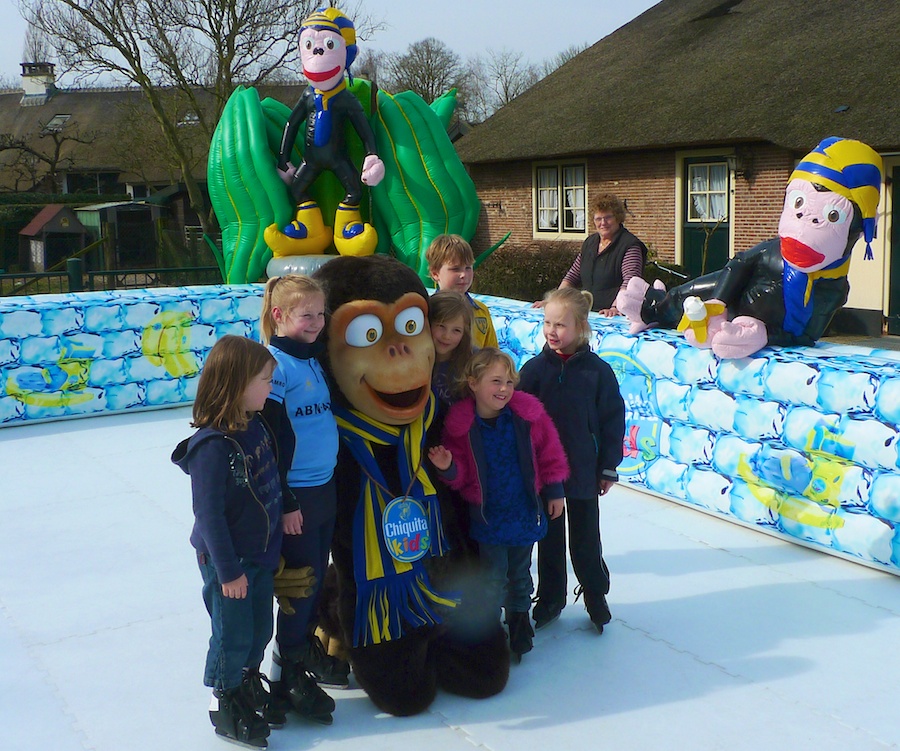 AH bood de kids een Chiquita-kunststof-‘ijsbaantje’ met versnapering aan op de dam van Thea en Bud. Bob de Jong had graag willen komen, maar …