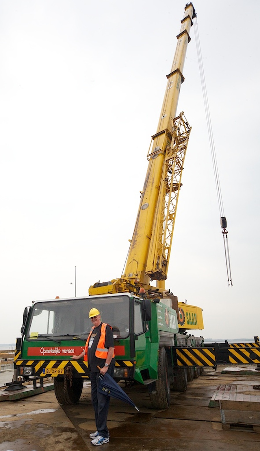Dag Rob, je lengte blijft indrukwekkend hoor. Ik kan me nog goed herinneren dat ik precies kon zien wanneer je thuis was aan Bij de Berg. Dan stak het stuur van je bromfiets (Puch ?) boven de heg uit, echt gaaf was dat. En als je aankwam in je VW Golf zat je achter de middenstijl, het leek alsof je op de achterbank zat, waanzinnig. Wat dat betreft is deze kraan meer in verhouding. Nu ziet het geheel er heel gewoon uit.