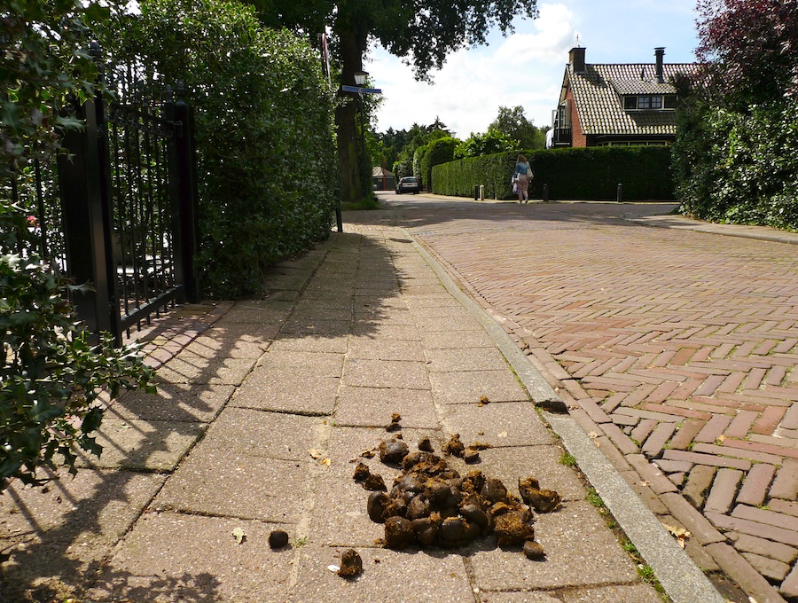 … maar wel twee vraagjes: 1. waarom moest er op de stoep praktisch recht voor voor een tuiningang worden gepoept; 2. waarom heeft de ruiter een en ander niet conform de geldende APV-verplichting opgeruimd?