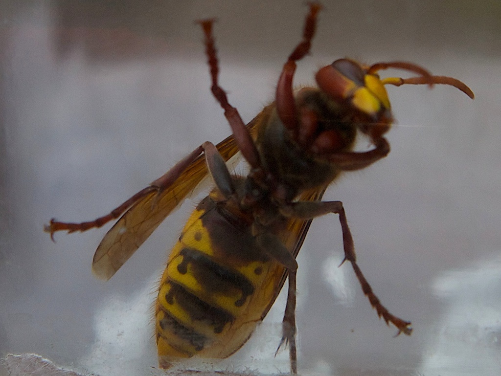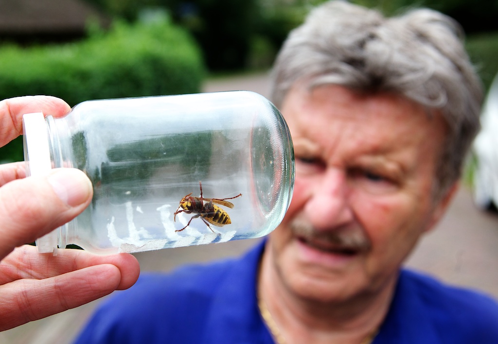 Rijksgediplomeerd plaagdierenbestrijdingstechnicus Joep Koenders ruimde deze week een nest met Hoornaars, wespen die bijna drie keer zo groot zijn als de normale Duitse of grondwesp. Ze zijn wel iets minder agressief.
