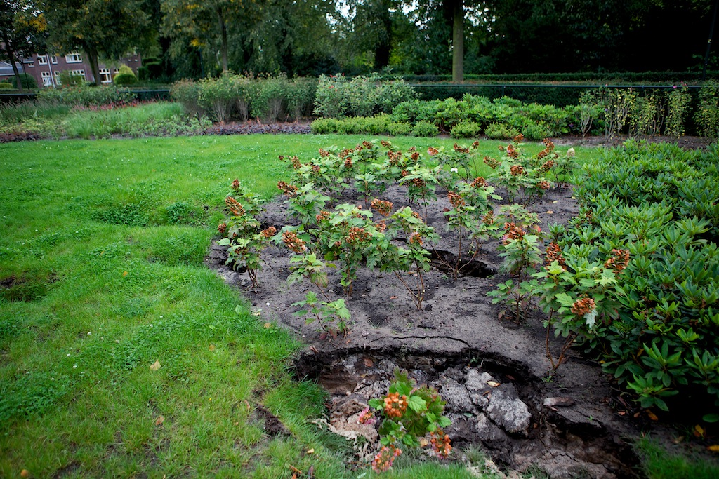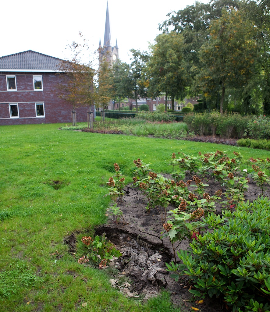 Op het terrein van De Wingerd, aan de zijde Pastoor Jongeriusweg; her en der kuilen/spleten van ruim één meter diep.