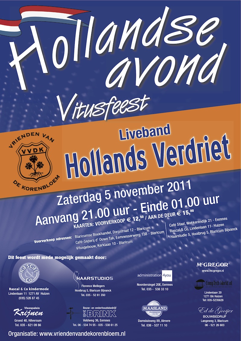 Leuk dat ’t Oog ook aandacht besteedt aan de feesten van Vrienden van de Korenbloem. Het is al weer vier jaar geleden dat een drtietal enthousiaste dorpelingen het plan gestalte gaven om zo drie a vier keer per jaar een ‘ouderwets’ feest te organiseren. Natuurlijk in ’t Vitusgebouw, hoe kan het anders. Deze avonden worden altijd druk bezocht door heel veel Blaricummers en zij die op andere wijze een band met het dorp hebben. Voor de één een ware reünie en voor de ander een ga-uit-je-dak-show. Elke keer een goeie live band, maar er zijn ook avonden geweest waarop wel vier artiesten achtereen optraden. Een lekker glaasje bier erbij en succes is verzekerd!