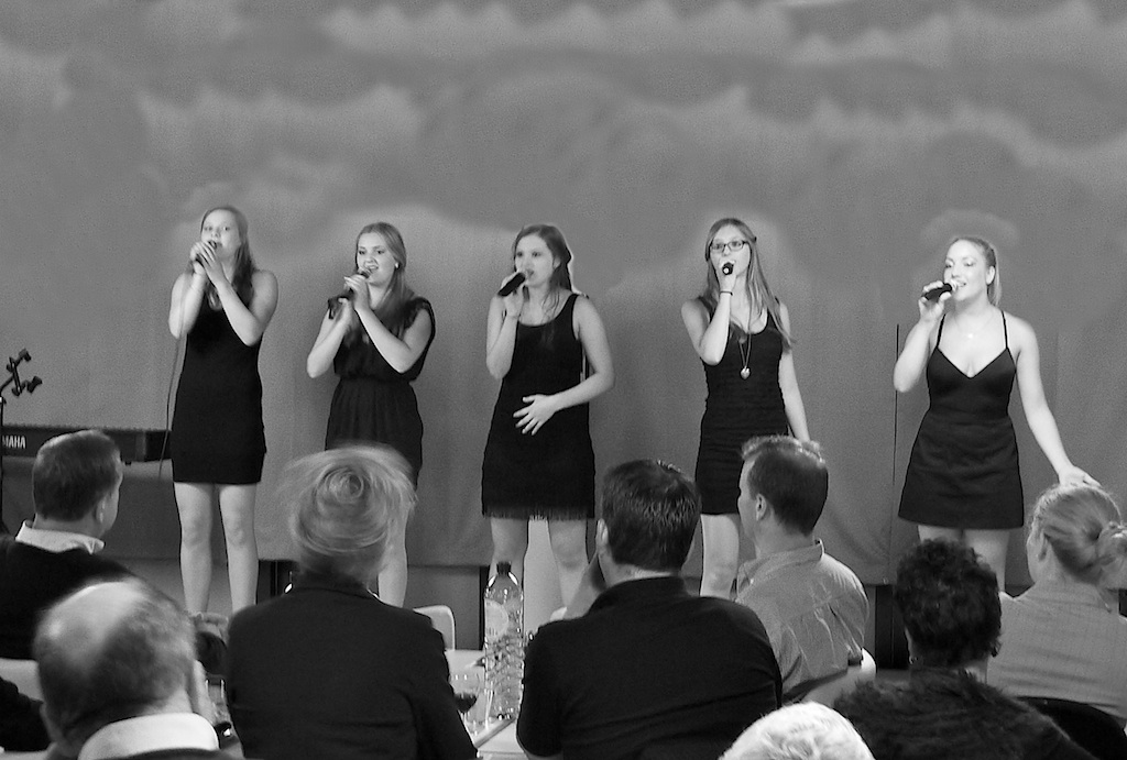 Blaricumse BOV (ondernemersvereniging) dineerde in De Blaercom en kreeg tussen de gangen door optredens van de Cabaret Cats.