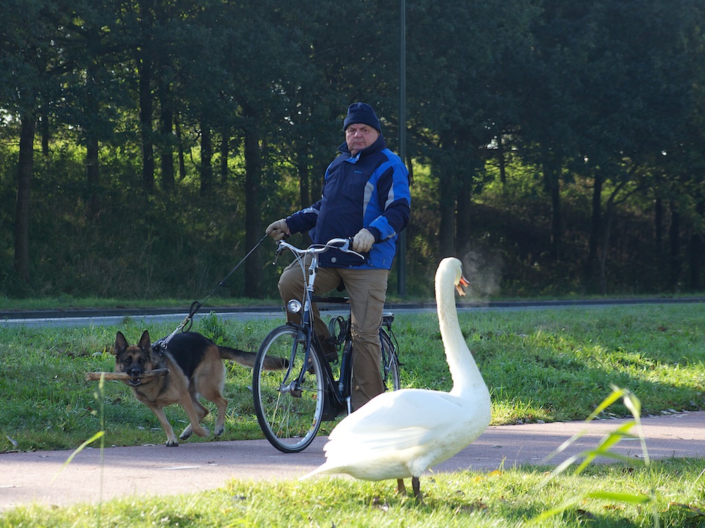 1. Leuke aktie foto. Wie let er op wie? De hond denkt ik lust je rauw- De zwaan denkt help, wat heb ik gedaan- De hondenbaas géén paniek, alles onder contrôle!