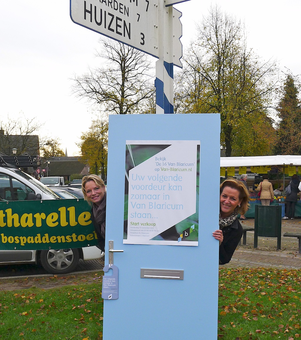 Makeldames Van Vliet en Vermaak van De Nieuwe Gooische doen een ludieke actie voor 16 Vierde Kwadrant– (aka Blaricummermeent-)woningen die binnenkort in de verkoop gaan.