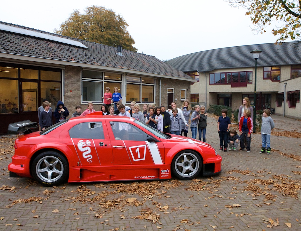 … leerling van groep 7 van de OBB. Vanmiddag hield ik een spreekbeurt over de ‘dinky toy’ van m’n oom. Coole bak, want het is een Alfa 156 3.0 | V6 | 24 V Coloni – en daarvan is er maar één op de wereld. Carrosserie van koolstof en achterin een Formule 3000-motor. Hij heeft net zoveel pk’s als ‘ie zwaar is. Voor de duidelijkheid had ik ‘m maar even meegenomen en op het schoolplein geparkeerd … Vette LOL!