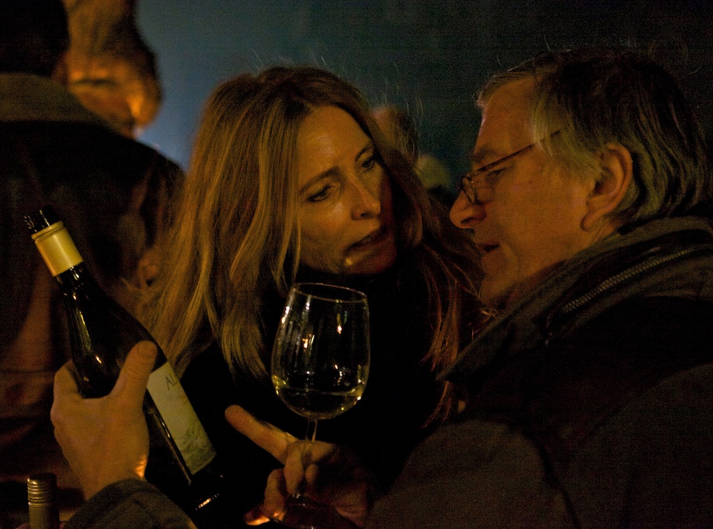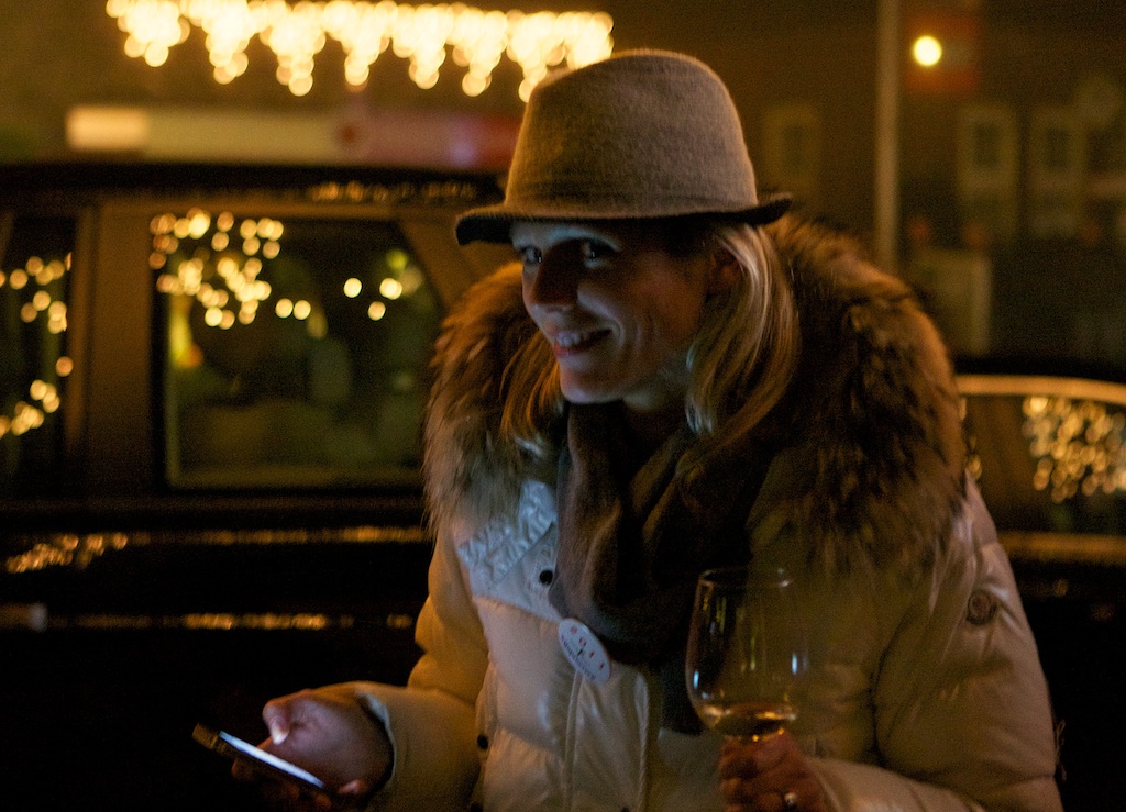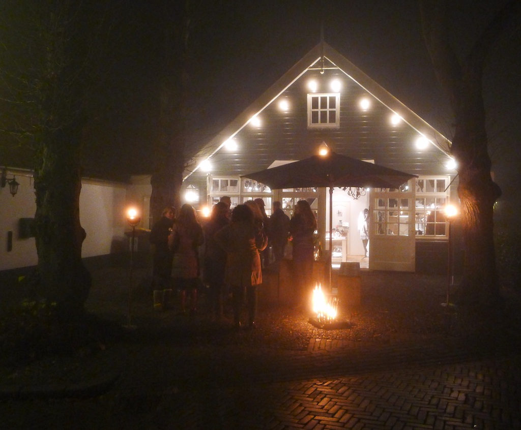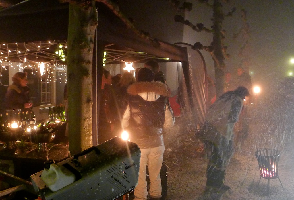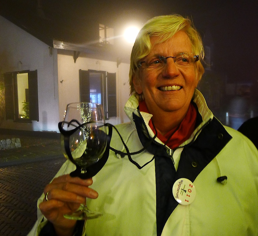 Dit jaar kwam de mist vóórdat het eerste glas was geproefd … – terwijl er op de Brinklaan zowaar een heuse Nieuwe Gooische sneeuwstorm woedde. En D66-raadslid Mieke Bakker kon al snel goed overweg met het glastuigje dat ze van Fred van Sprang Edelsmid had gekregen. Zo rond half tien begonnen we oog te krijgen voor waar het werkelijk om gaat met zo’n wijnproeverij …