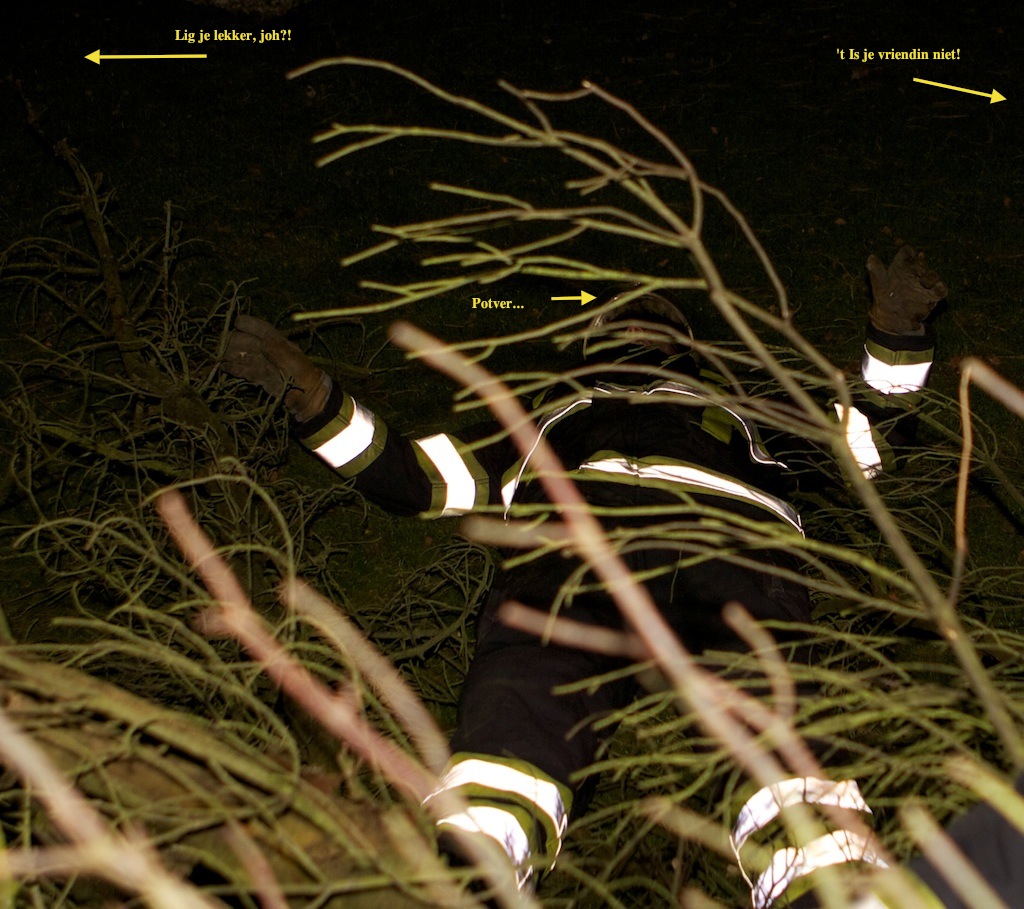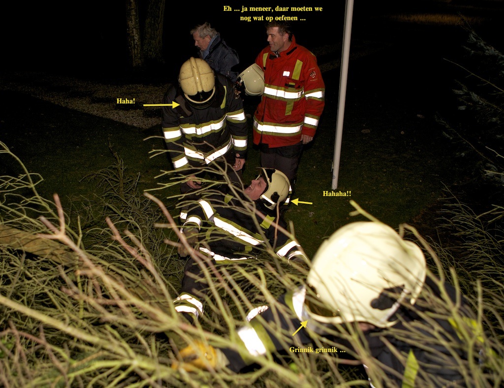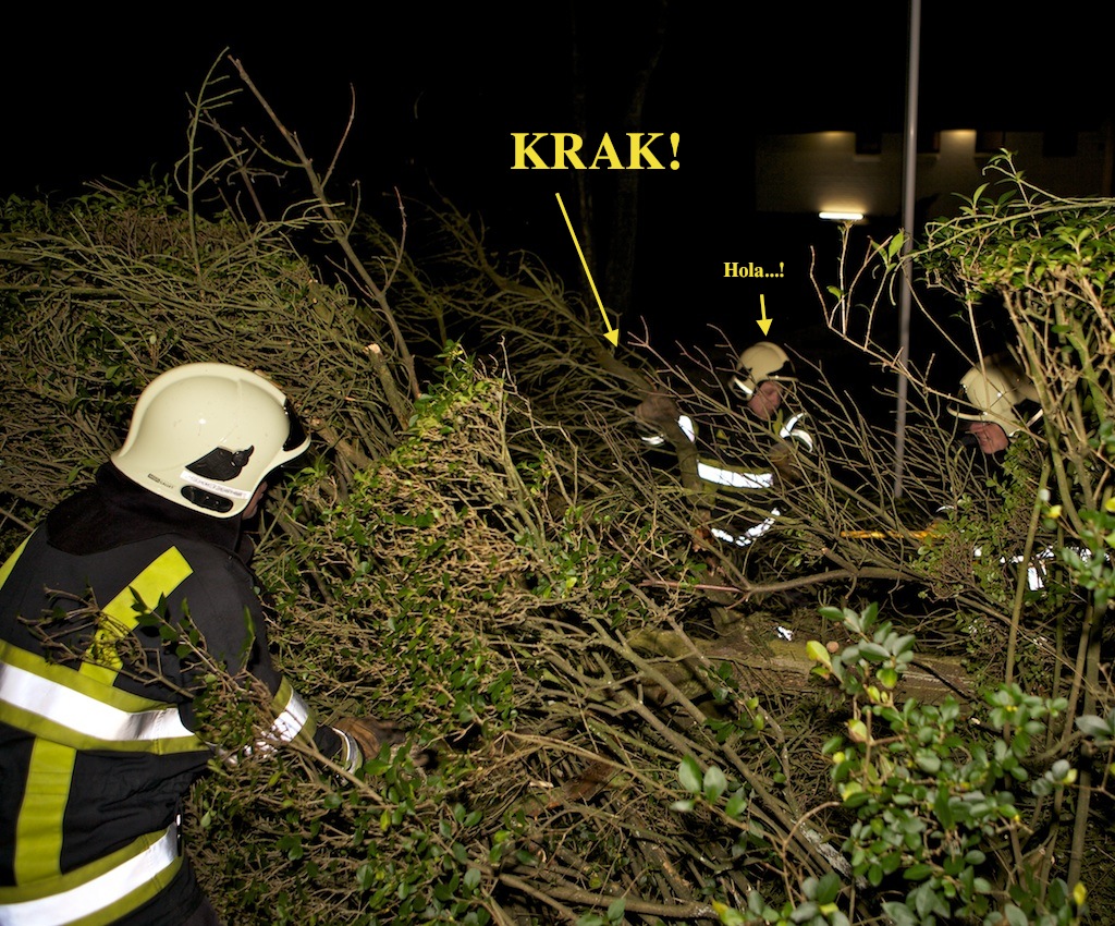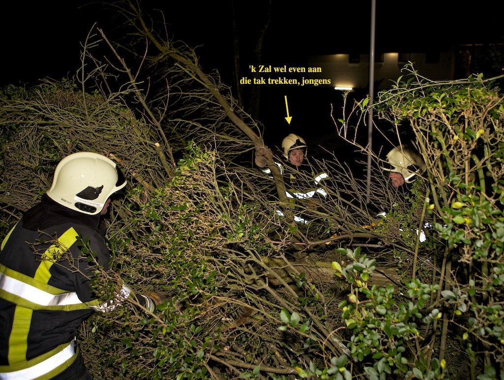Naarderweg, boom omgewaaid. Tijdens het opruimen door de brandweer brak er nog een tak af – dat was niet bedoeld. Geen persoonlijke schade, dus veel lol.