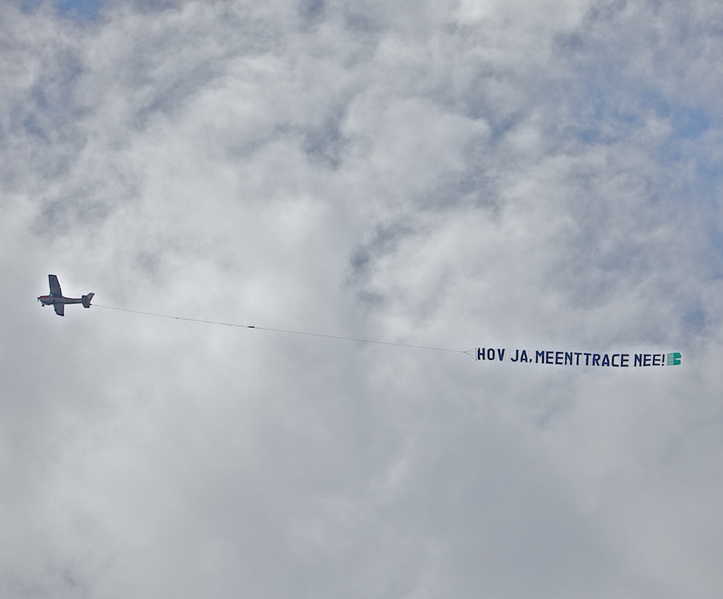 In het kader van de IBP Dag 2012 (Integraal Bereikbaarheids Plan) kwam ook Elisabeth Post, VVD-gedeputeerde verkeer en vervoer van de provincie Noord-Holland, even in Hilversum bij de nieuwe tunnel onder de Soestdijkerstraatweg langs voor handjes, kusjes en een babbel. Zoals bekend is Elisabeth, tegen het onwaarschijnlijke en bedenkelijke af, een melkweggrote voorstander van de HOV langs het Meenttracé. Eveneens is bekend dat de lokale politiek massief tegen dat overbodige en geldverspillende idee is – en dat werd Elisabeth goed leesbaar nog even kenbaar gemaakt. (Nu goed: het vliegtuigje met sleep cirkelde rond van 15:10 – 15:25 uur en de gedeputeerde kwam stevig te laat pas om 15:45 aanzeilen … – maar de door de lokale politieke partijen gefinancieerde bedoeling was zonnig en duidelijk.)