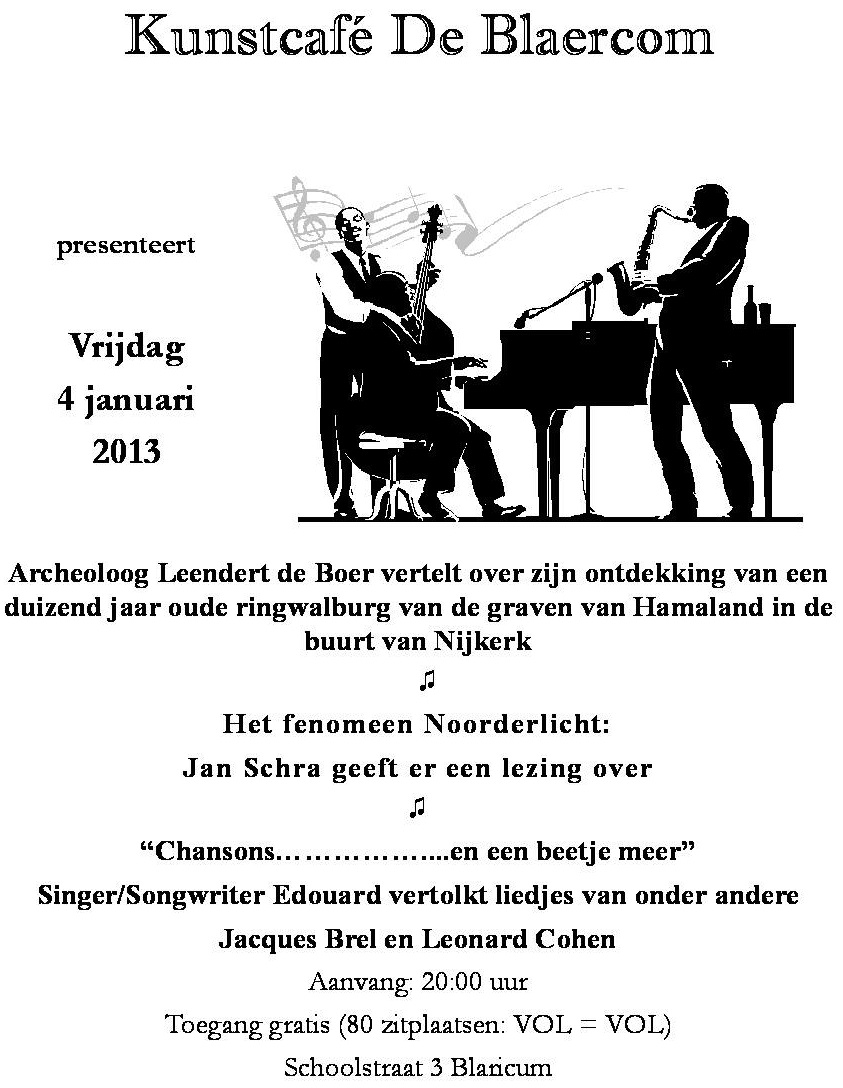 Het Kunstcafé in dorpshuis De Blaercom biedt op vrijdagavond 4 januari een leerzaam programma met Franse chansons en bevlogen sprekers over voor velen onbekende cultuurgebieden. Zanger Edouard begeleidt zichzelf op de gitaar met zijn smaakvolle Franse repertoire. Leendert de Boer uit Nijkerk komt vertellen over zijn spraakmakende oudheidkundige ontdekkingen in de driehoek Nijkerk, Voorthuizen en Putten. De bezoeker van het Kunstcafé maakt ook kennis met een onvermoede kant van Jan Schra van de bekende zeilschool uit Huizen. Hij gaat de geheimen van het Noorderlicht onthullen.