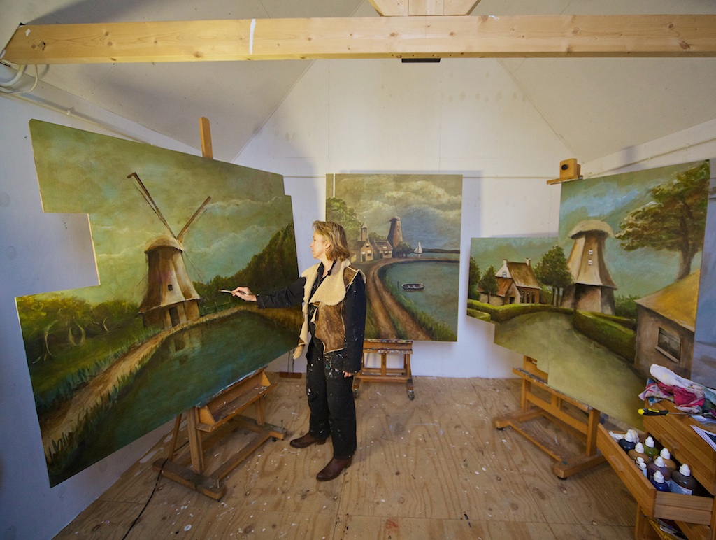 Hoi Celine, wat een mooi werk maak je ervan. De rechter is volgens mij de Blaricumse molen die op de ‘Molenberg’ heeft gestaan tot 1928. Nu is dat Tweede Molenweg 49. Mooi dat dit stuk geschiedenis op deze wijze wordt bewaard voor het nageslacht. Hulde voor de opdrachtgever en de kunstenares.