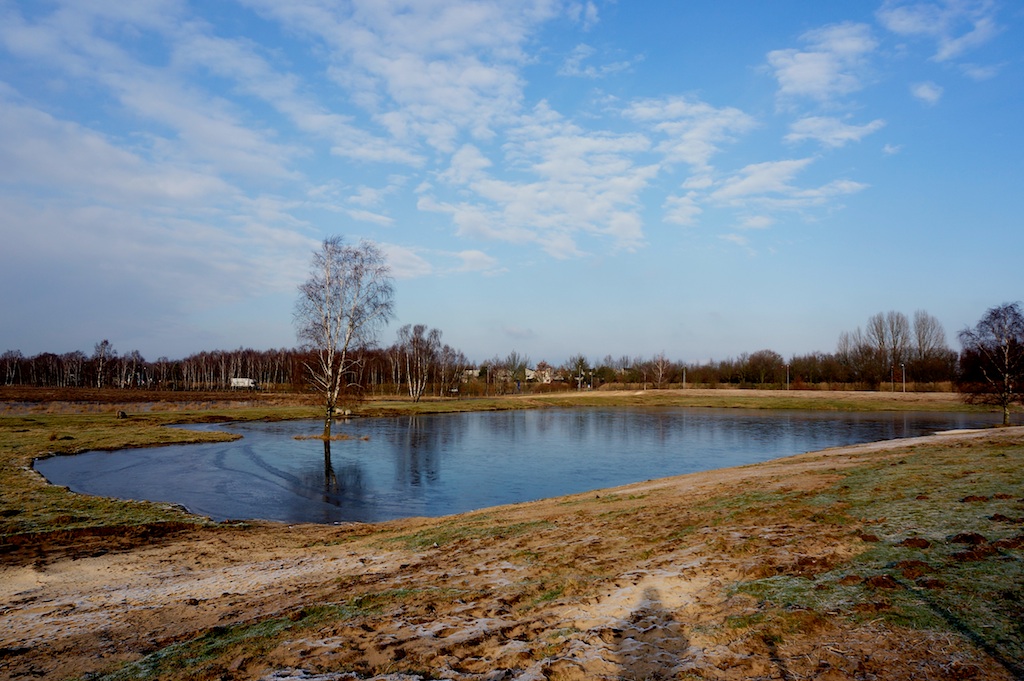 Oog: dit watertje was er 25 jaar geleden niet (Blaricummerweg/Randweg-Oost) en een lel van zo’n runderhoorn overleeft men niet