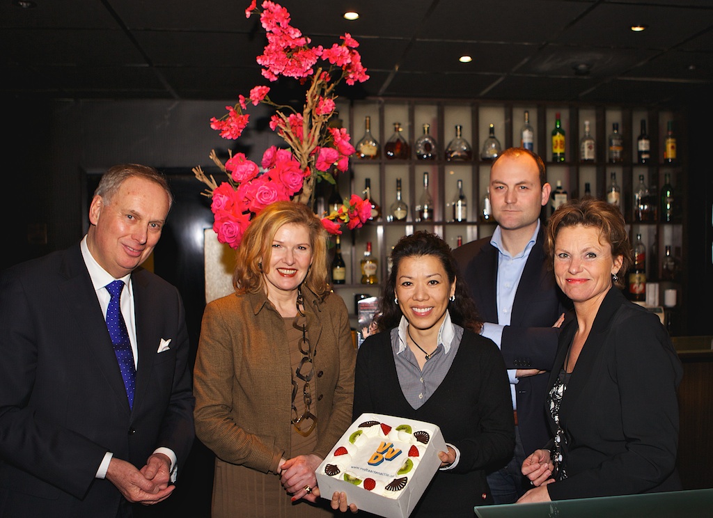 In het kader van de jaarlijkse VVD Taartenactie van de Statenleden van de VVD Noord-Holland (voor personen/organisaties die zich verdienstelijk hebben gemaakt voor de samenleving) heeft Wimmy Hu van The Red Sun op voordracht van VVD Blaricum vanmiddag een taart mogen ontvangen. Reden is dat Wimmy de afgelopen jaren middels benefietdiners en andere activiteiten zeker twee miljoen euro aan goede doelen heeft kunnen schenken. Taart-aanbiedster van dienst was Statenlid Petra van Hartskamp – de Jong. Een en ander vond plaats in aanwezigheid van wethouder Rob Posthumus, VVD-bestuurssecretaris Monique van Dijk (vandaag jarig!) en fractievoorzitter Ralf van Vegten.