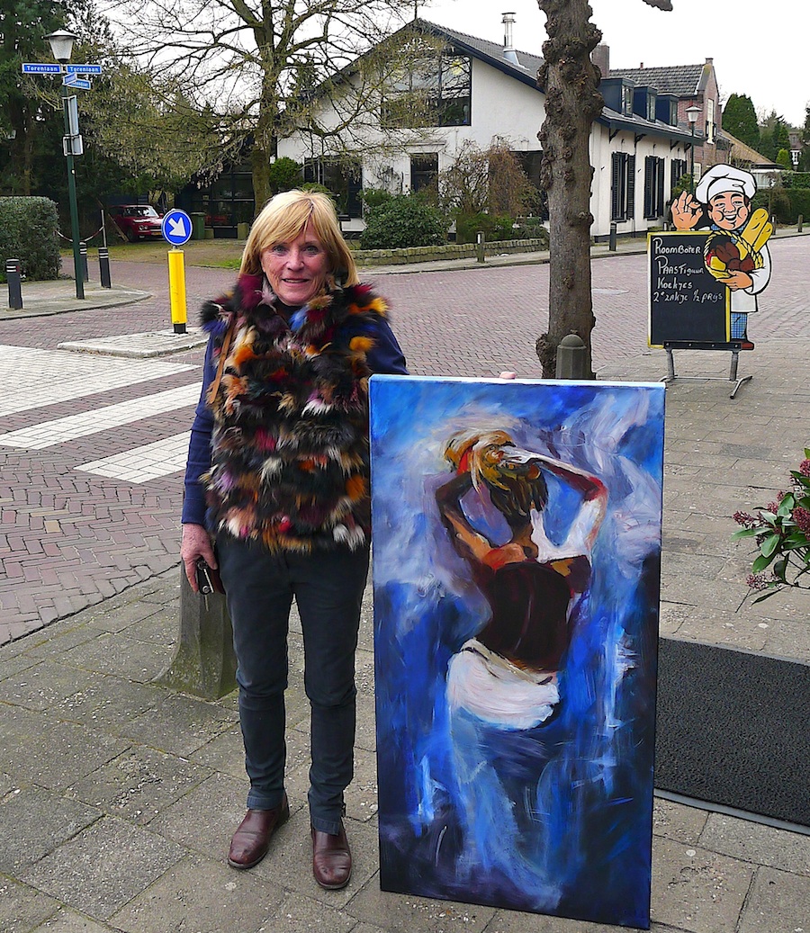 Tilly Feld uit Baarn met een van haar schilderijen – net verkocht. Meer doeken zijn te zien bij het Blaricumsche Vloerenhuys. En de bakker verkoopt weer andere lekkernijen.