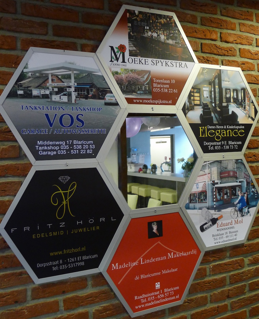 Reclamepanelen in hal van Blaercom-gebouw. Er zijn nog plaatsen beschikbaar: geïnteresseerde ondernemers kunnen daarover contact opnemen met hoofdbeheerder Jolanda Raven.