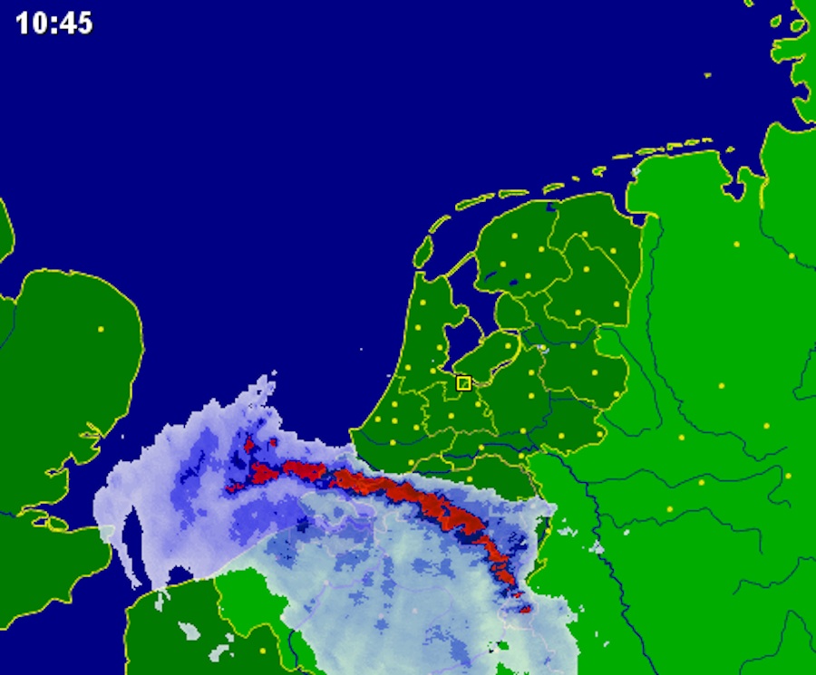 Een front met zware onweersbuien trekt van zuidwest naar noordoost. KNMI heeft voor alle provincies code oranje afgegeven: extreem weer.