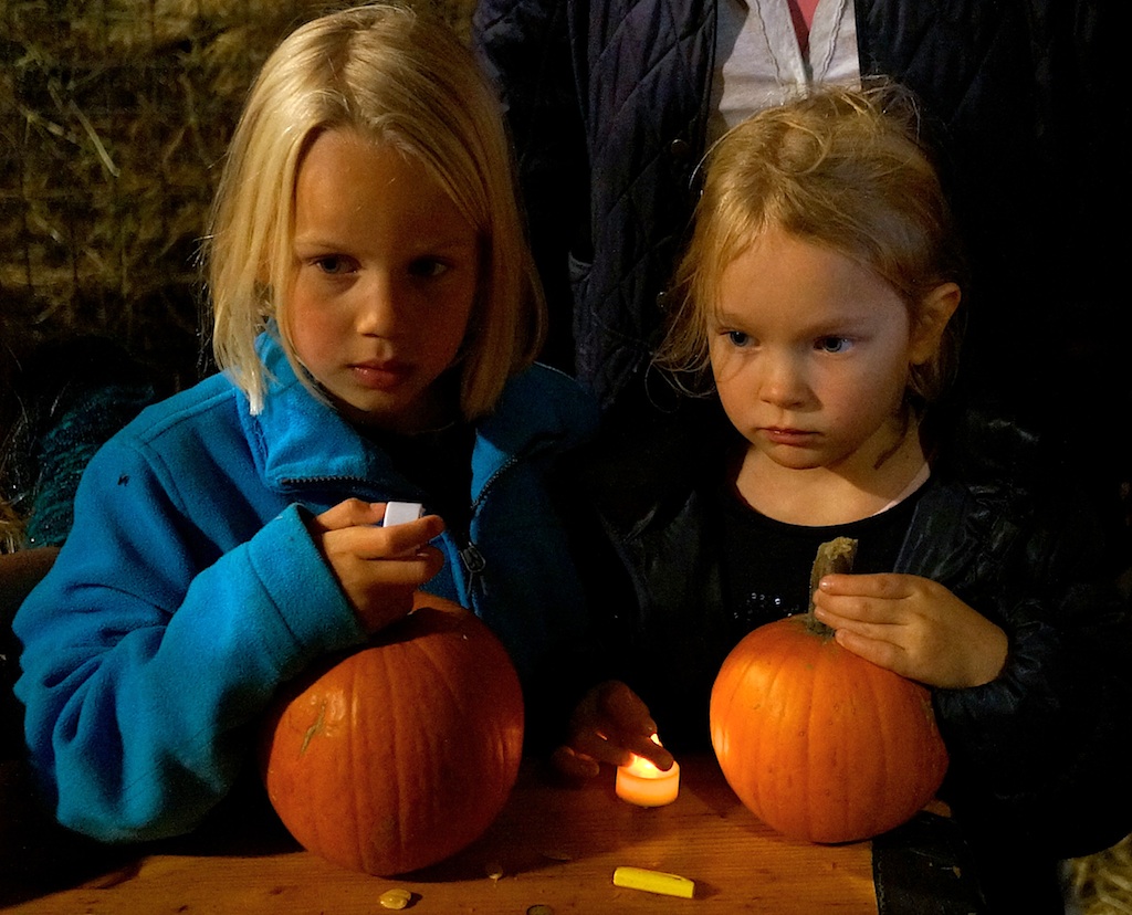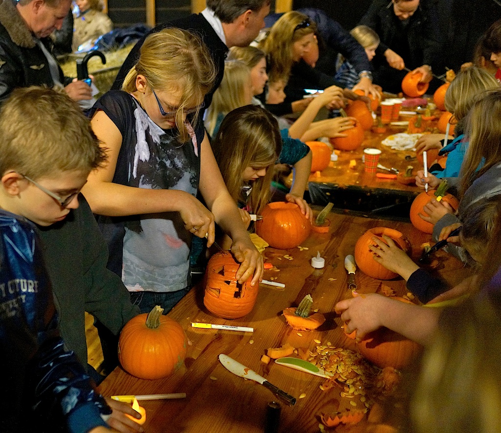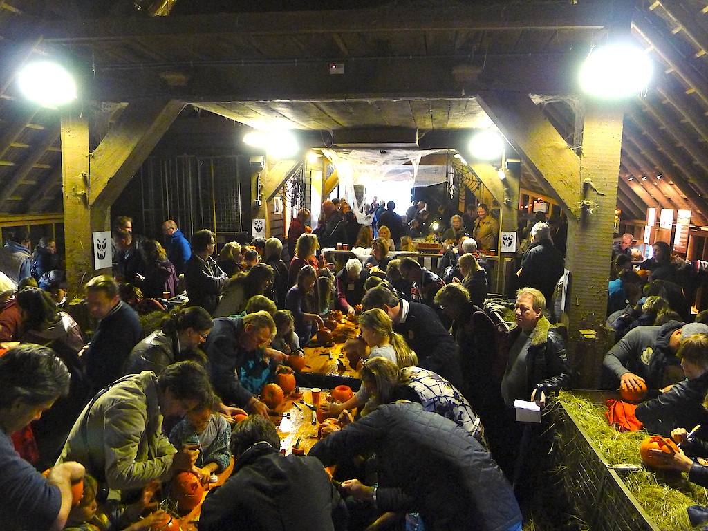 In een zeer drukke schaapskooi werden vanmiddag voor Halloween zo’n 200 pompoenen door vooral ‘jong’ tot enge koppen gesneden.