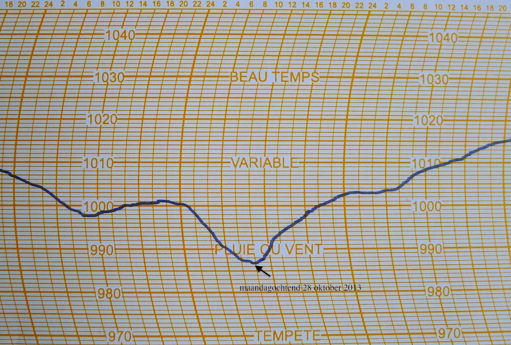 De storm van afgelopen maandag op de Oog-barograaf. Luchtdruk hoogtepunt storm: 986,5 hPa; luchtdruk vandaag 12:00 uur: 1013,2 hPa.