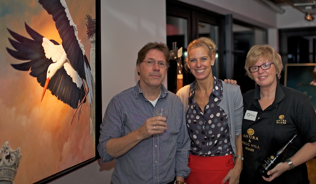TT Events van Tera Houting-Joosen organiseerde gisterenavond aan de Huizerweg onder de naam Out of Africa … into Blaricum een wijnproeverij van wijnen van de Anura Vineyards in Zuid-Afrika, gepresenteerd door importeur Fran Kleijn (r). Aan de muur hingen (soms met een knipoog geschilderd) ‘dierenwerken’ van de Laarder schilder Nico Bierlaagh. Het volgende event van TT Events is een modeshow op 13 november.