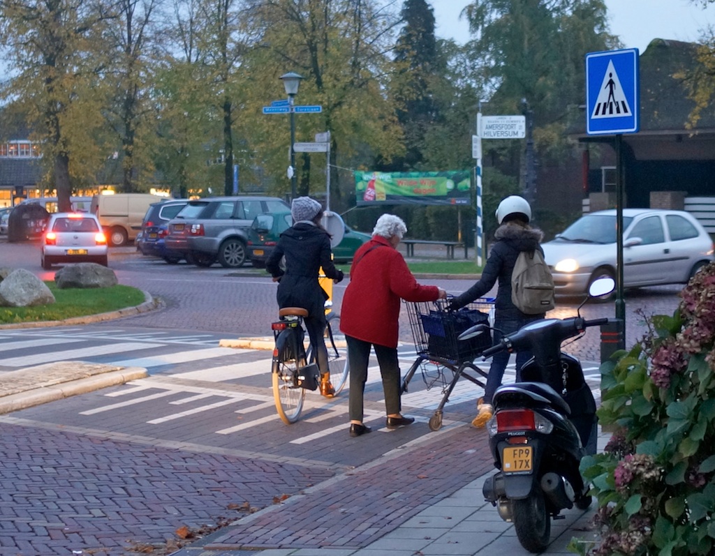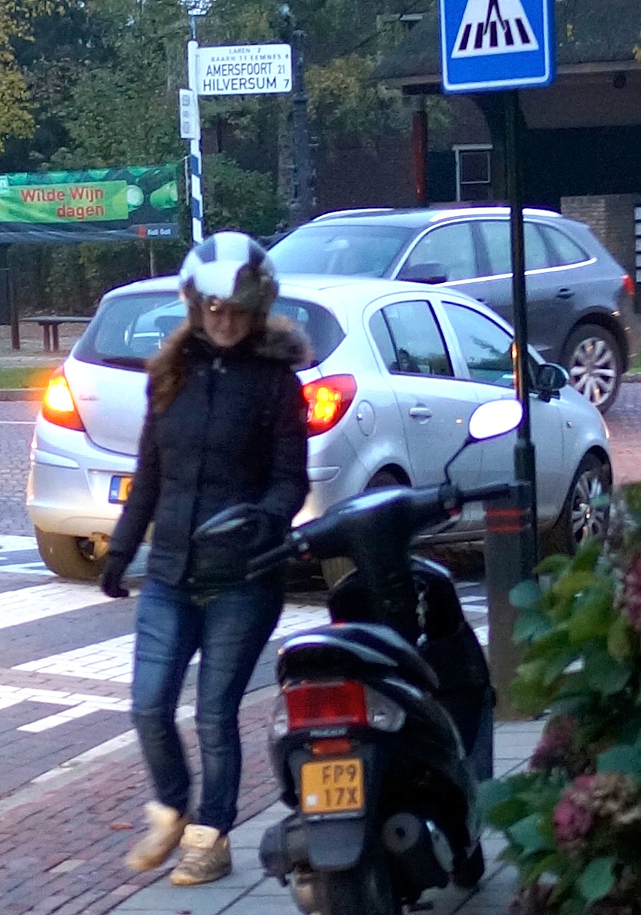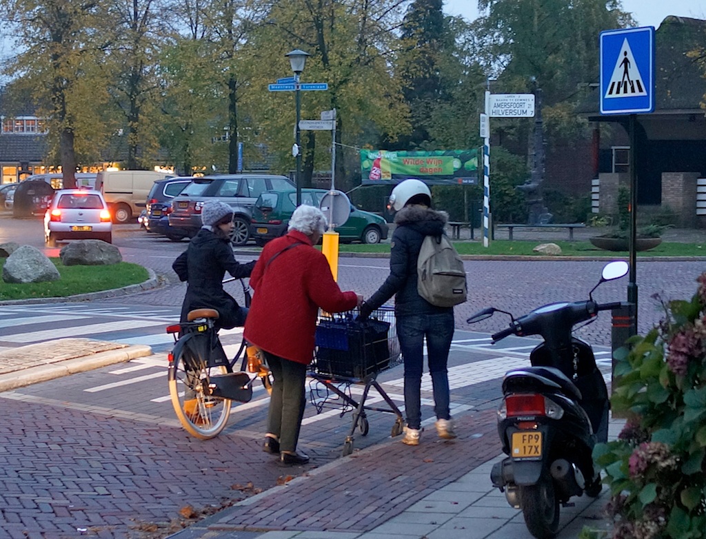17:02 uur, Huizerweg/Torenlaan. Oude dame krijgt karretje met boodschappen niet de stoep op. Alerte scoorterchick ziet dat, rijdt erheen, stapt af en helpt dame met kar de stoep op. Die verdient een pluim! (En het meisje met de muts krijgt er ook een, een kleintje.)