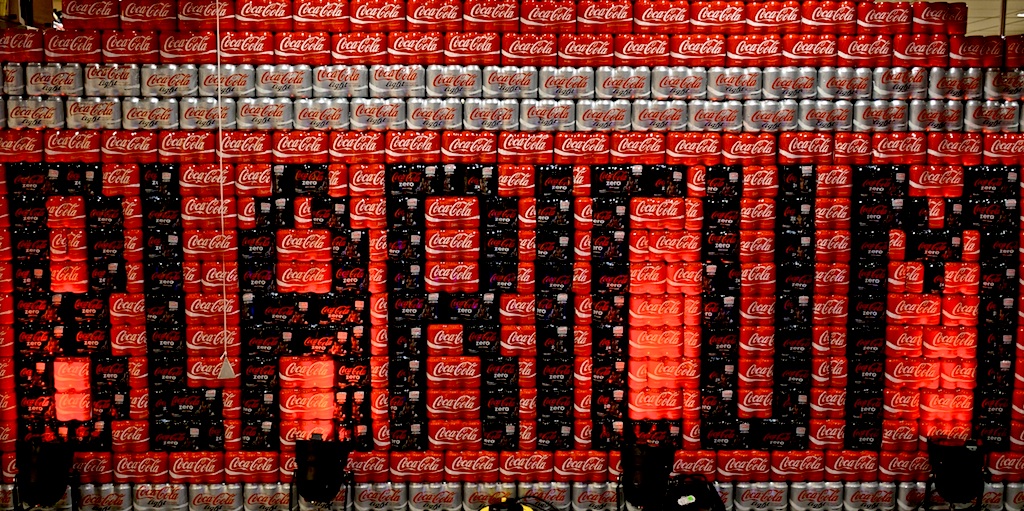 AH, actie van Coca Cola. In de winkel is met 4-packs van Coca Cola een Blaricumse boerderij (…) gebouwd. De vraag is hoeveel liter CC er in totaal in de gebruikte blikjes zit. De winnaar (1 per winkel) krijgt een zitzak.