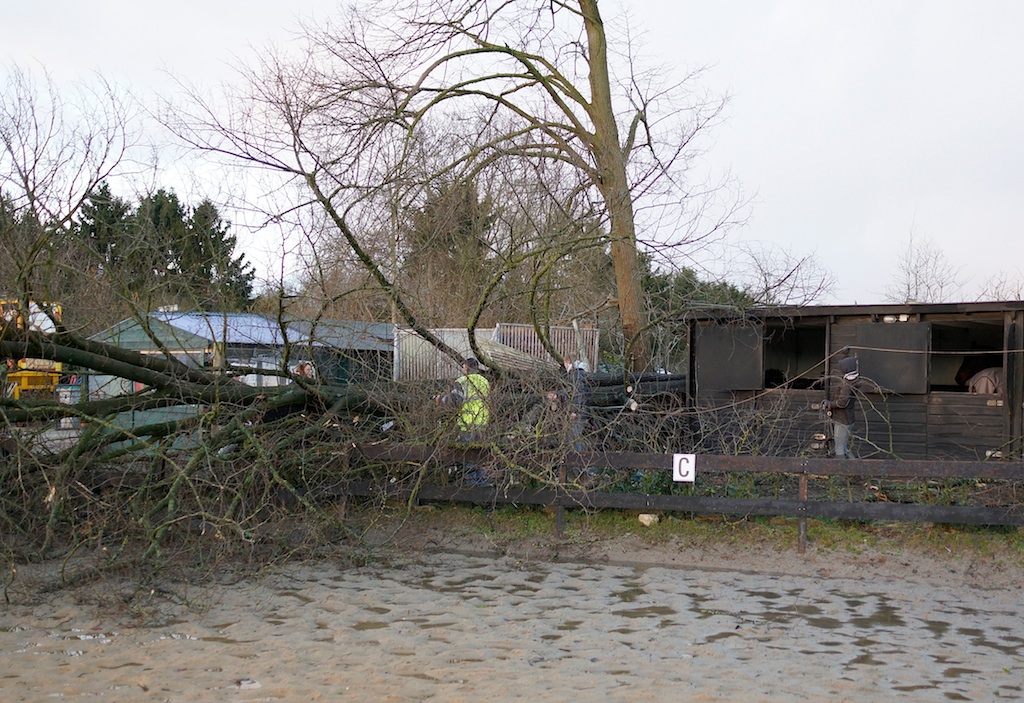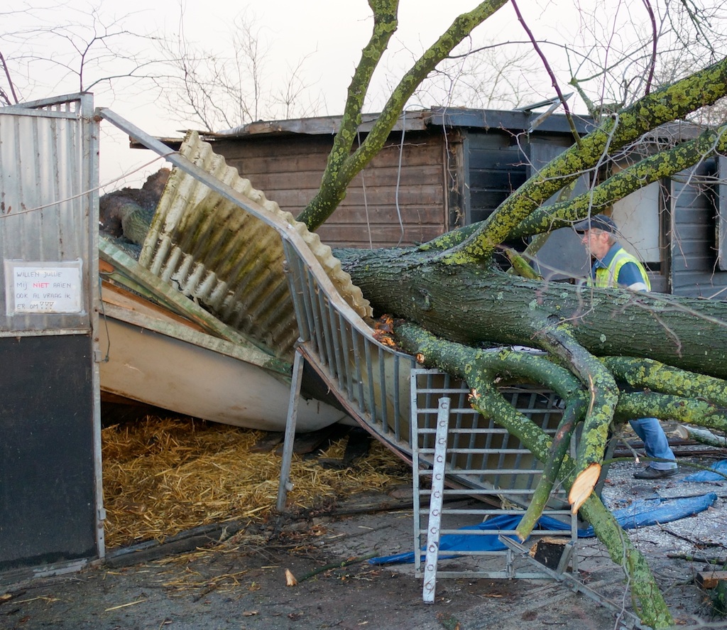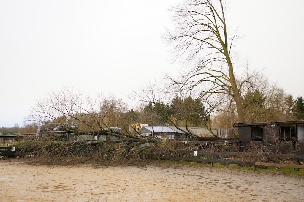 Goyergracht: bij Stal Rieder ging gisterenmiddag rond 16:30 uur een eik om, vermoedelijk door blikseminslag en de storm. De eik viel op een box waarin een paard stond. Met behulp van Brandweer Eemnes en Blaricum is het dier uit zijn benarde positie bevrijd, met alleen een hoofdwondje en een op een voet. De schade is aanzienlijk.