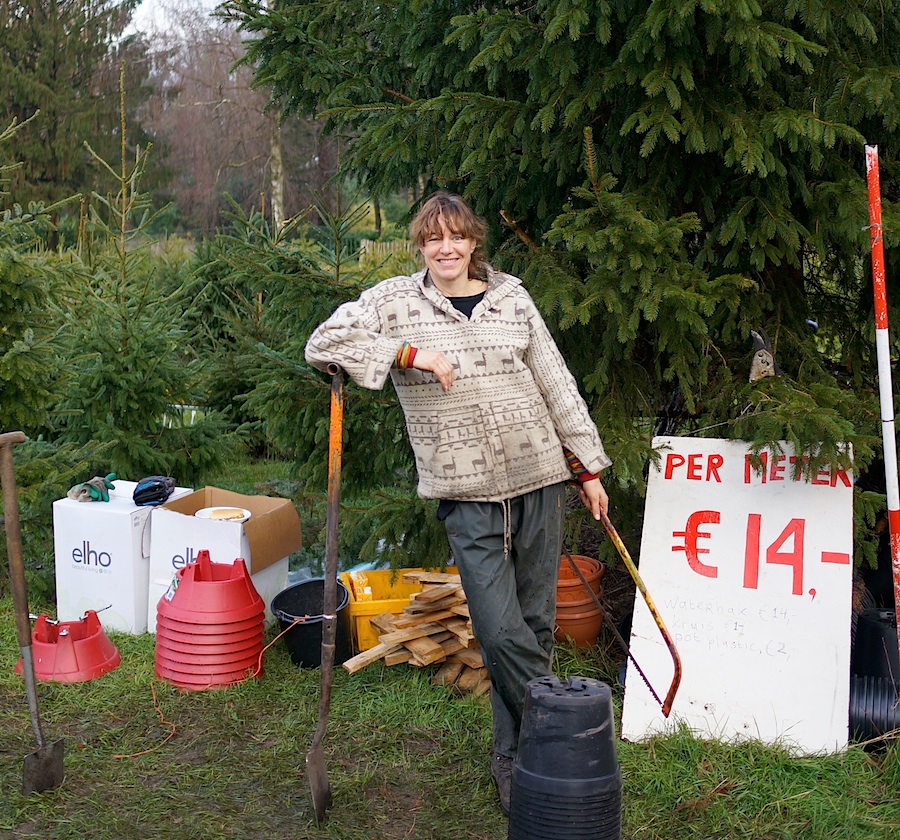 Schier onbeperkte voorraad op de kerstbomenakker van Bakker aan de Naarderweg. Mariëlle: ‘Met kluit of kruis of niks, kan allemaal.’