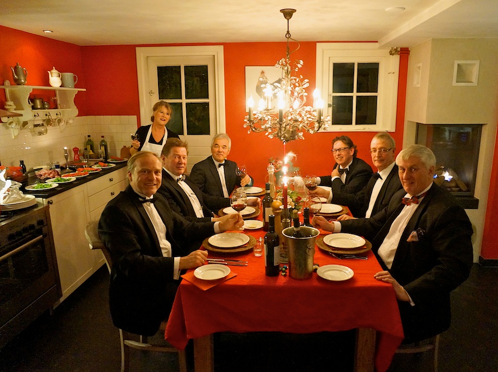… deze meneren die hier dineren. Ze laten de dame welwillend het alleenrecht aan het aanrecht en maken zich op voor het voorrecht van het voorgerecht. Wat hen bindt eren de heren met strik en stijl en goede smaak en beste verhalen. Geen staatsgreep bedacht, geen oorlog verklaard, met beschaafd plezier het verleden waarderen – en dat ‘iets’ een tafel lang vereren.
