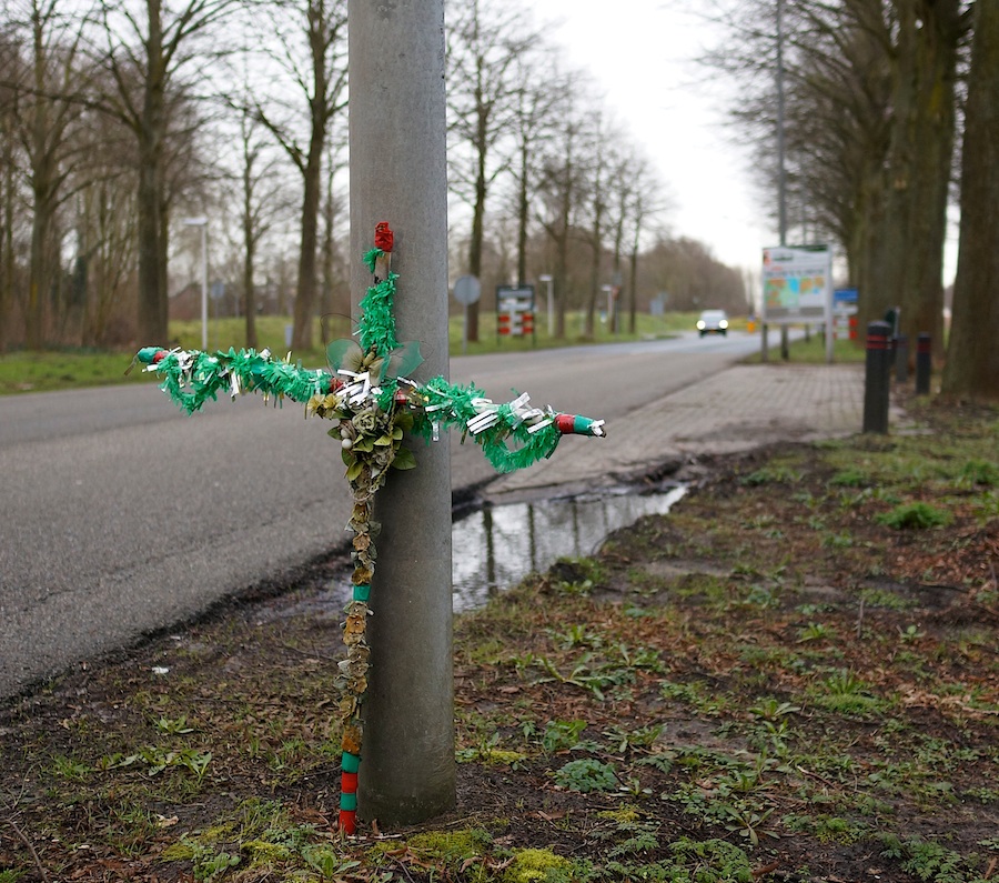 Ik neem dat het een verwijzing is naar de rij bomen achter het kruis die ten offer gaan vallen aan de zogenaamde hogesnelheidslijn/busbaan.