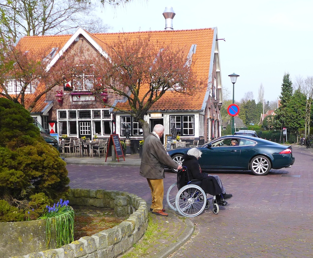 De gefotografeerde meneer en mevrouw waren net zonder om te kieperen rechts van de stoep gekomen; het de andere stoep optrekken lukte eerst niet en na wat wrikken met ‘pijn en moeite’ wel. Op de stoep bleek de stoel eerst niet en wederom na wat wrikken en schuren net wel tussen muurtje en houten anti-parkeerpaal door te kunnen. Pas na een meter of 20 kon de stoel worden gedraaid en reed mevrouw weer vooruit.