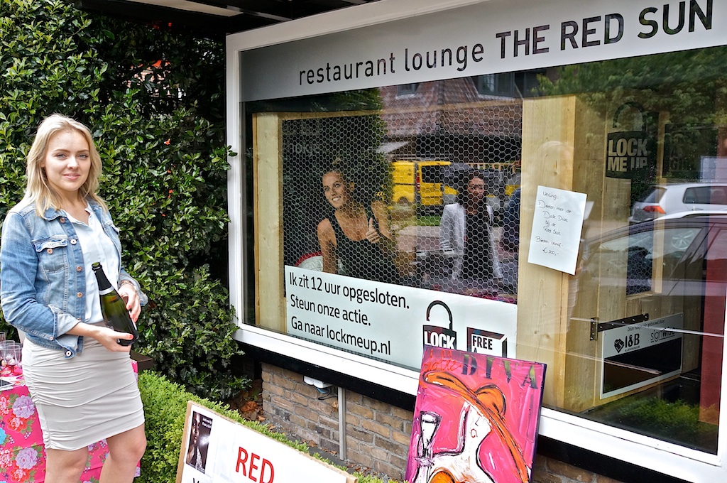 In het ‘peeshok’ zit Claudette Martens, een van de deelnemers aan Lock me up – Free a girl. Een collega van haar probeert passanten met een lekker glaasje te verleiden – tot een donatie.