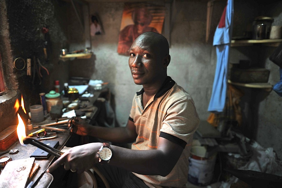 Modou Thiam uit Senegal, 48 jaar, edelsmid. Begon een sieradenwinkel met een microkrediet.