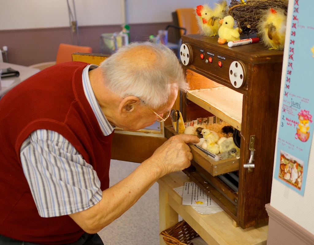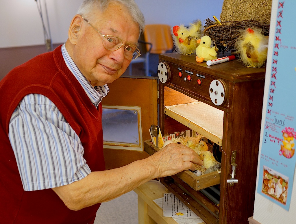 Leuke foto,s van mijn vader die zichtbaar geniet van de kuikentjes die geboren zijn. Dat wordt beschuit met muisjes eten.