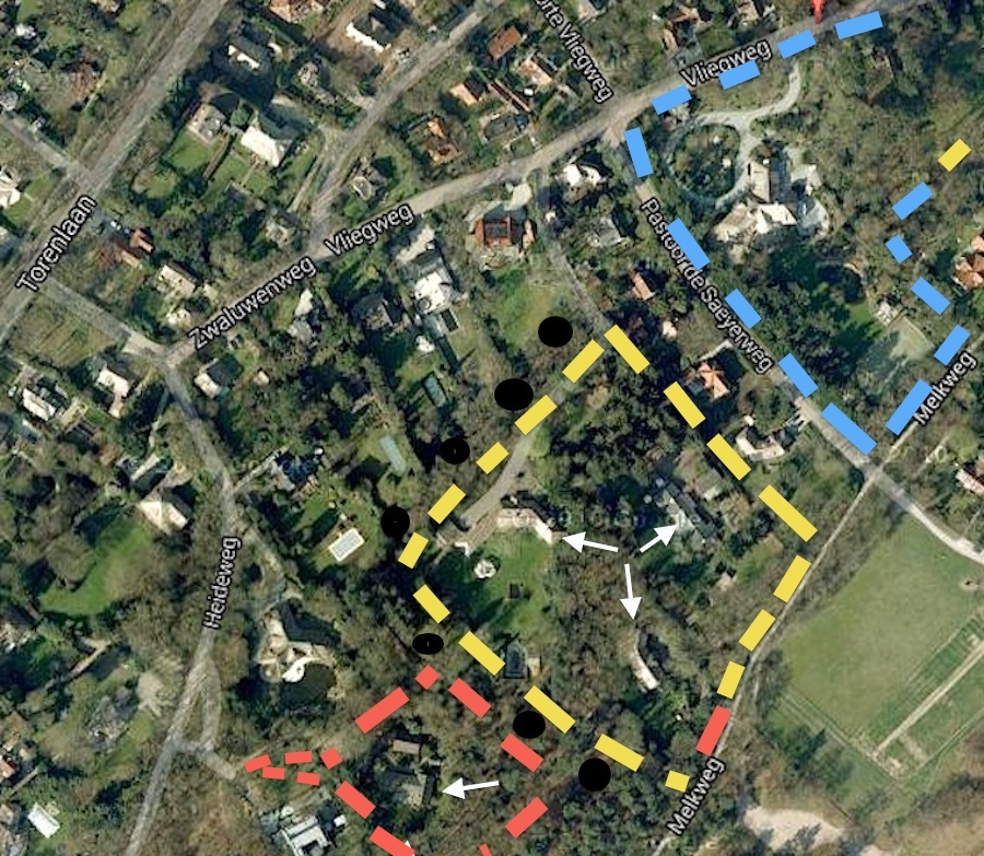 Her en der in de media valt te lezen dat John de Mol onlangs een vierde woning (rood gestippeld) in de directe nabijheid van zijn huidige woning (blauw gestippeld) heeft gekocht. Het gaat om Heideweg 3. Op het terrein is inmiddels een hek geplaatst met daaraan een bord van een sloopbedrijf. Het pand zal dus dezelfde weg gaan als de eerdere drie (geel gestippeld, witte pijlen) die De Mol de afgelopen jaren heeft gekocht. Wat de plannen zijn is vooralsnog niet duidelijk. Feit is wel dat het onlangs aangeschafte perceel van de drie eerder gekochte tereinen wordt gescheiden door wat in de volksmond heeft ‘Het Dromenlaantje’ (zwarte stippen) – en dat zou openbare grond zijn. Samenvoeging lijkt derhalve niet aan de orde.