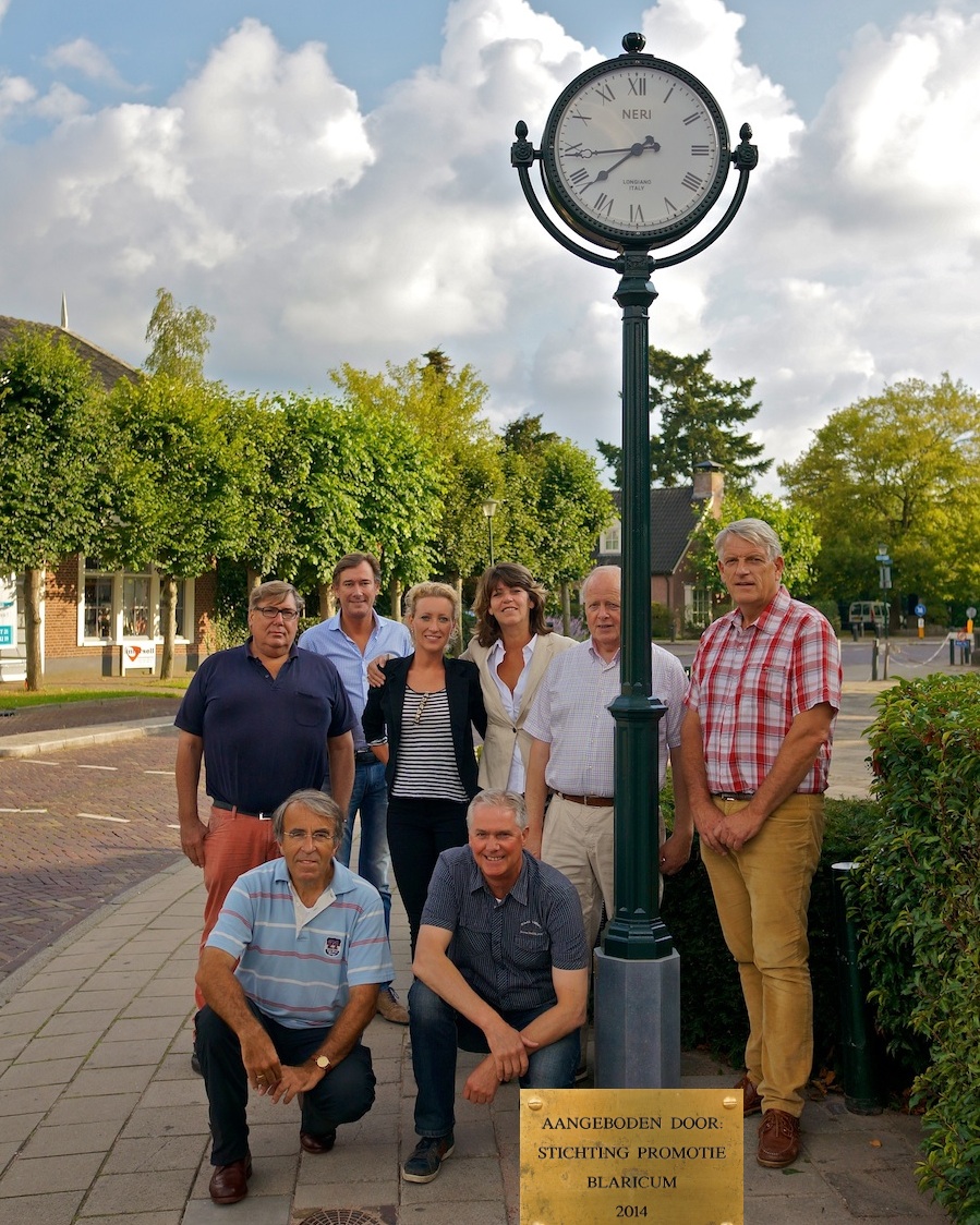 Tevreden is het bestuur van Stichting Promotie Blaricum over de nieuwe klok en haar plaats; een tikje is men verbaasd het over het feit dat de half vergane voorganger er even verderop nog steeds staat.