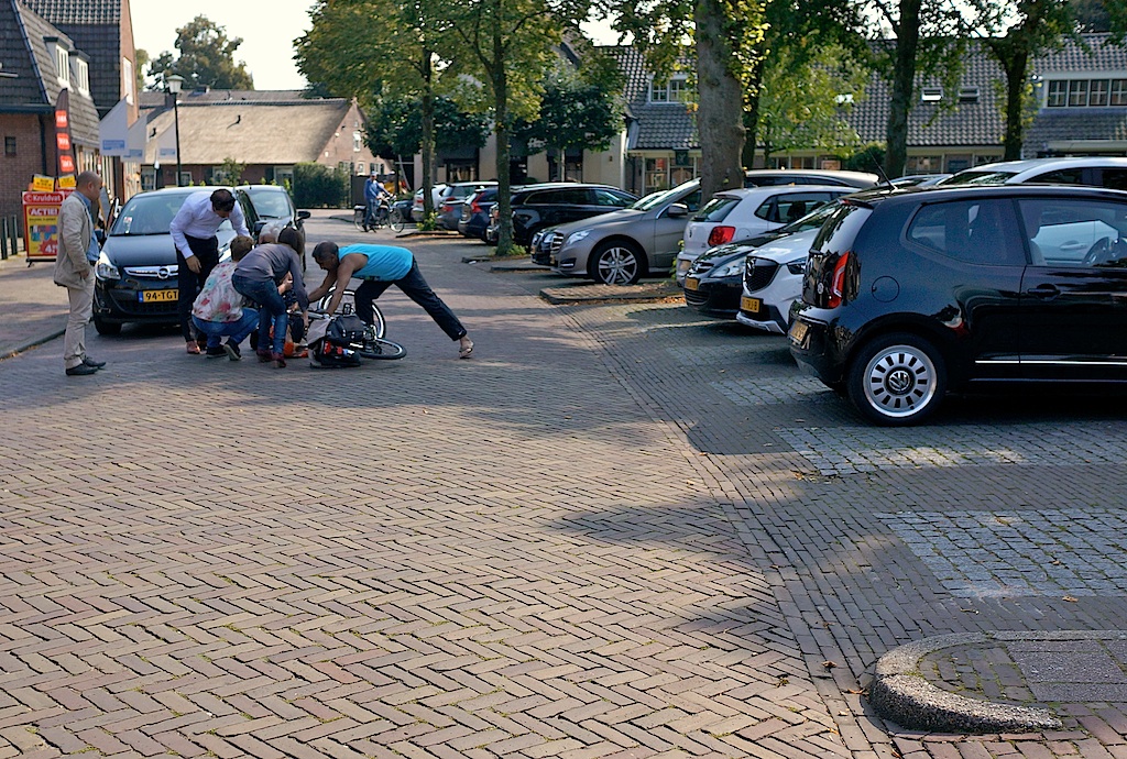 13:20 uur, Dorpsstraat: een uitparkerende VW (voorgrond) zag een fietsster over het hoofd, waardoor deze ten val kwam. Los van wat schrik overtuigde de gevallen dame de behulpzame omstanders van haar welzijn en vervolgde met een strak ‘doeg’je haar weg. (Kenteken VW bij Oog bekend.)