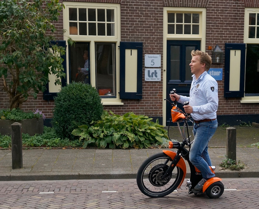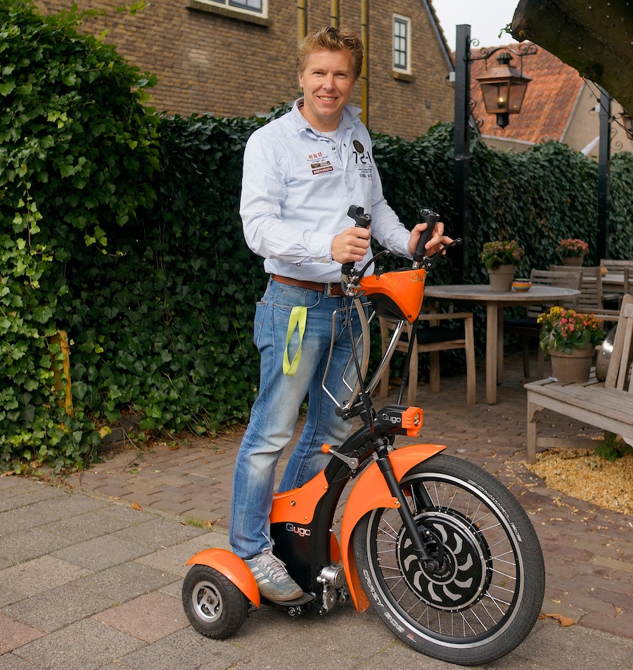 Driewielsnorfiets met elektromotor in het voorwiel en achterwieltjes die ski-achtig kunnen scharnieren, waardoor strak en schuin bochtenwerk mogelijk is. Veel stabieler, veiliger en goedkoper dan de Segway; NL-ontwerp en -produktie. Meer info hier.